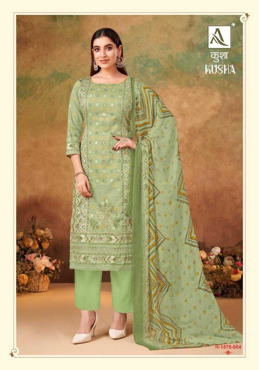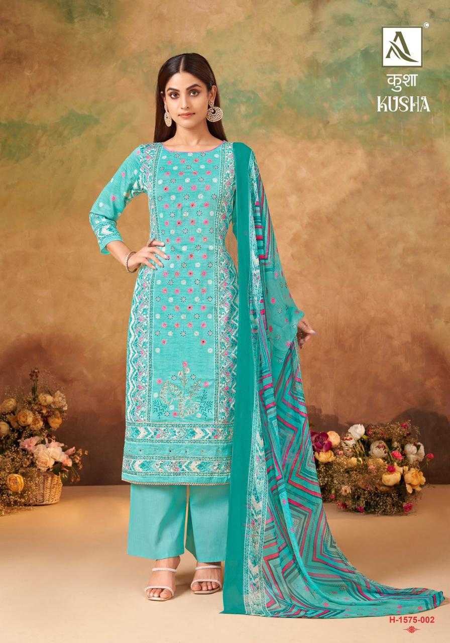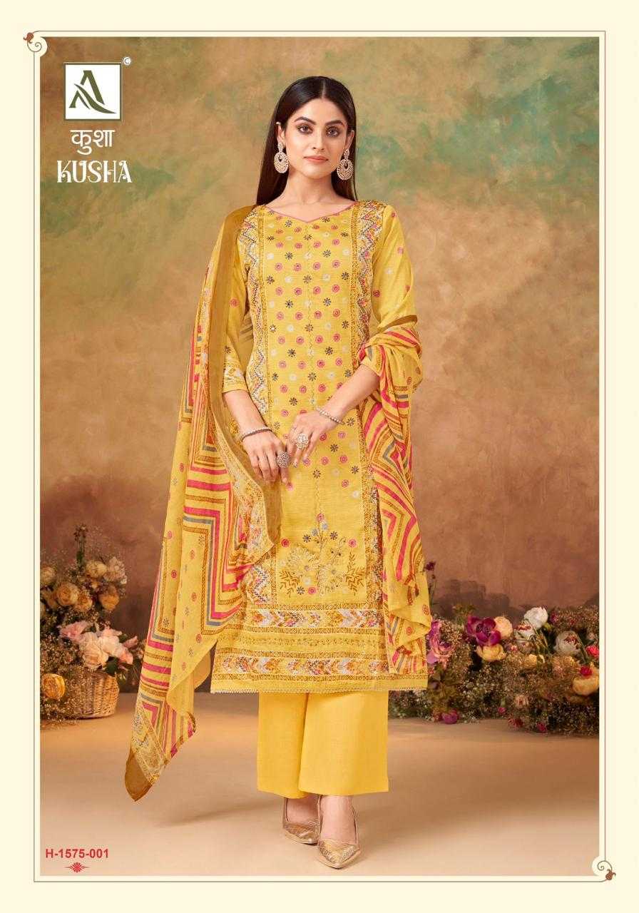 Looking for kusha by alok new trendy zam print hand work elegant look pakistani top pant with dupatta Full Catalouge at Best Price? Buy Now kusha by alok new trendy zam print hand work elegant look pakistani top pant with dupatta at Wholesale Rate of Rs 3625 with Total 5 Pcs from authroized dealer and supplier of Alok Suit Brand. Cost of Each piece is just only Rs 725 which is very low and affordable price to resale the product in your retail store. rrgandhi is Surat based Wholesale Supplier & Dealer of Alok Suit Brand. Click on Brand name to Know more about Brand's products.