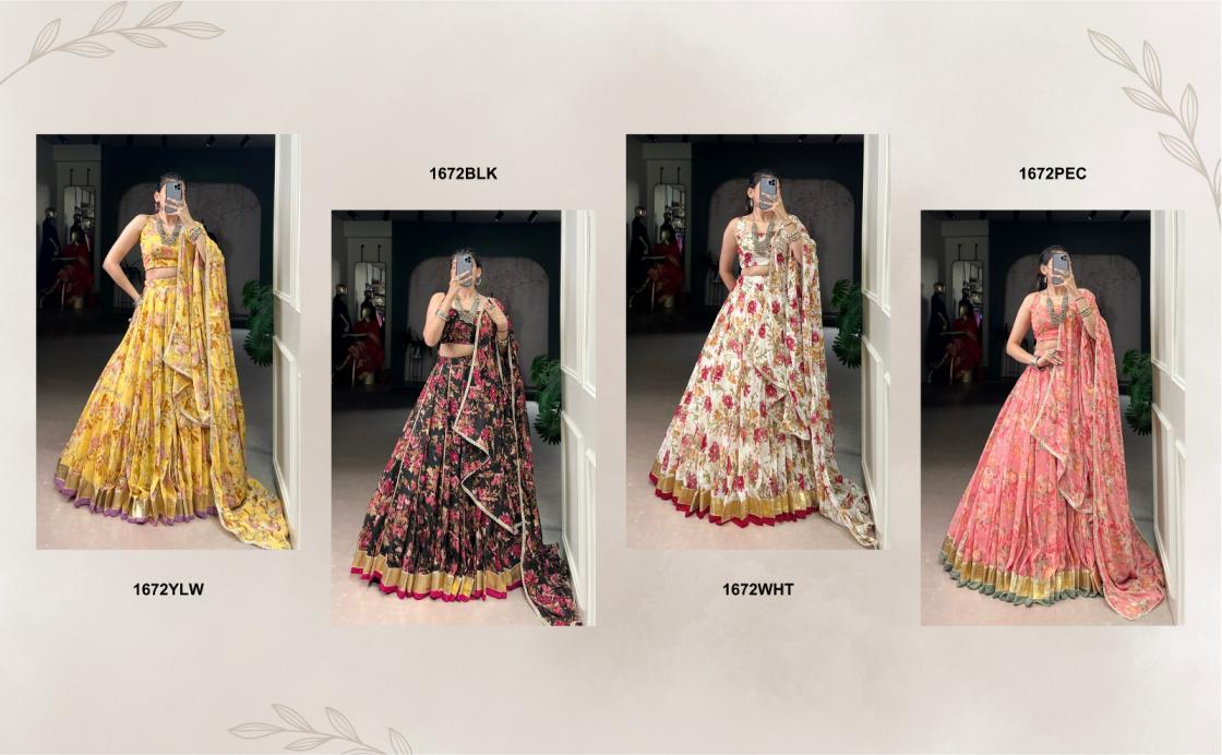 Looking for LNB1672 NAVRATRI SPECIAL CHIFFON FLORAL PRINT CHANIYA CHOLI Full Catalouge at Best Price? Buy Now LNB1672 NAVRATRI SPECIAL CHIFFON FLORAL PRINT CHANIYA CHOLI at Wholesale Rate of Rs 7200 with Total 4 Pcs from authroized dealer and supplier of P R Clothing Brand. Cost of Each piece is just only Rs 1800 which is very low and affordable price to resale the product in your retail store. rrgandhi is Surat based Wholesale Supplier & Dealer of P R Clothing Brand. Click on Brand name to Know more about Brand's products.