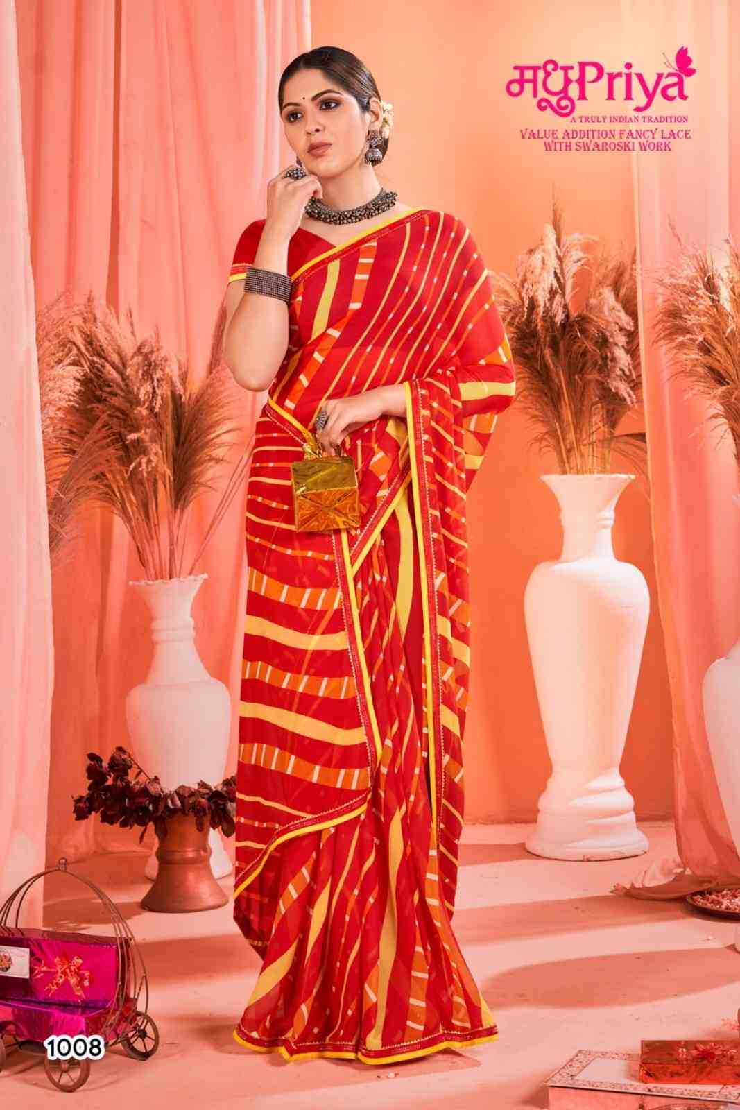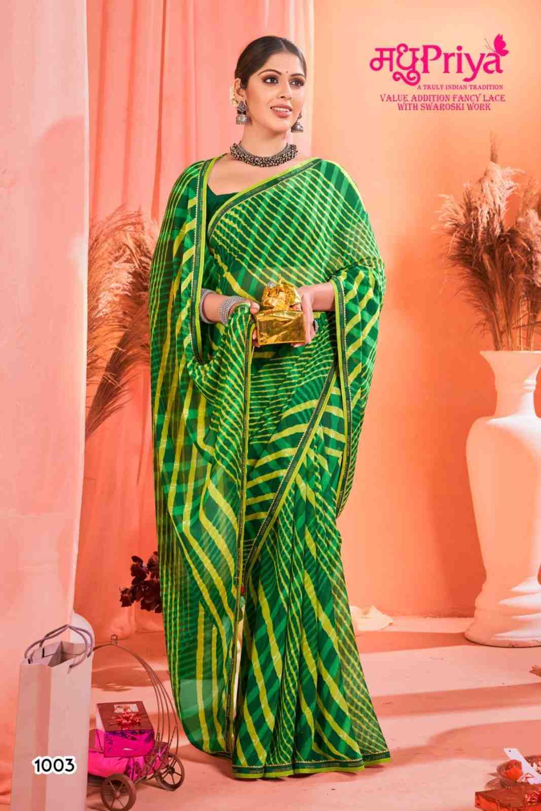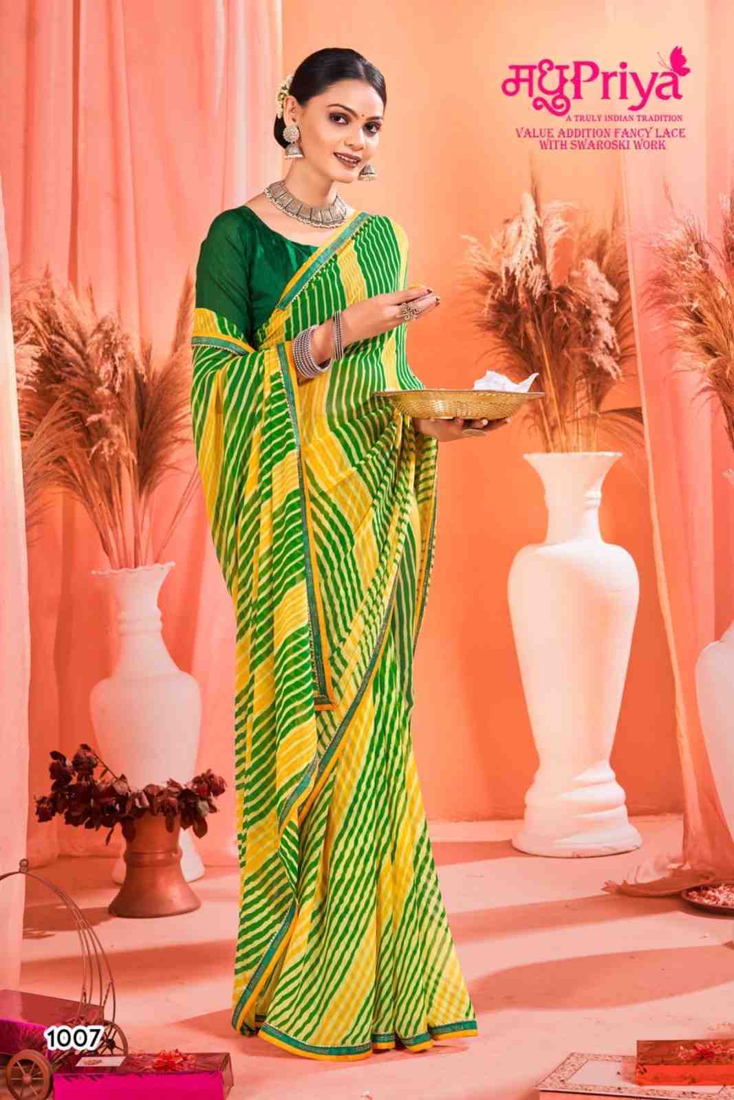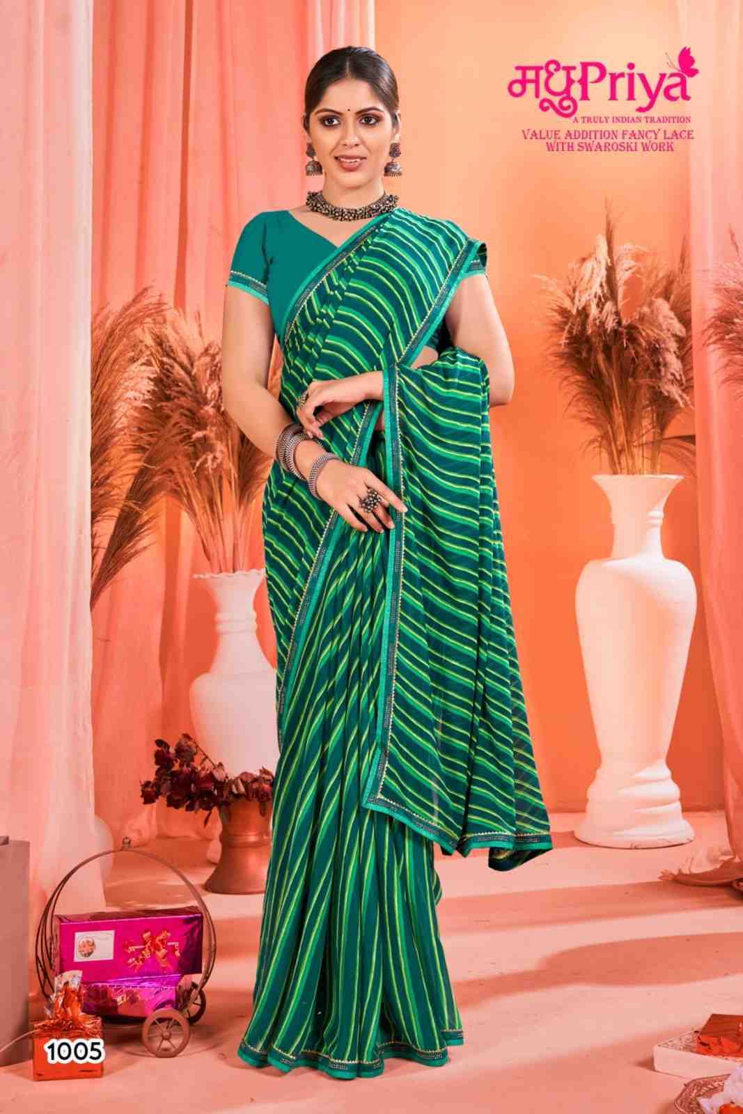 Looking for madhupriya chakori ethnic design weightless saree with blouse Full Catalouge at Best Price? Buy Now madhupriya chakori ethnic design weightless saree with blouse at Wholesale Rate of Rs 3120 with Total 8 Pcs from authroized dealer and supplier of Madhupriya Brand. Cost of Each piece is just only Rs 390 which is very low and affordable price to resale the product in your retail store. rrgandhi is Surat based Wholesale Supplier & Dealer of Madhupriya Brand. Click on Brand name to Know more about Brand's products.