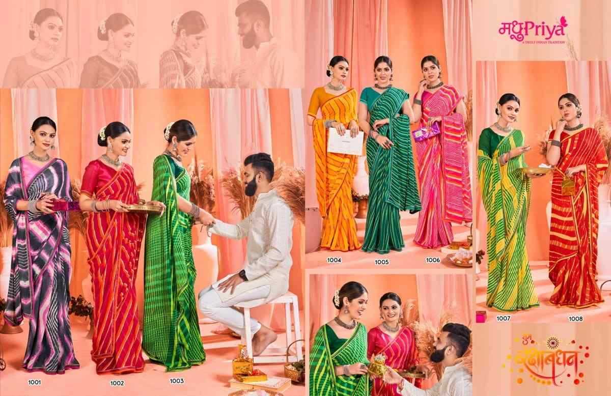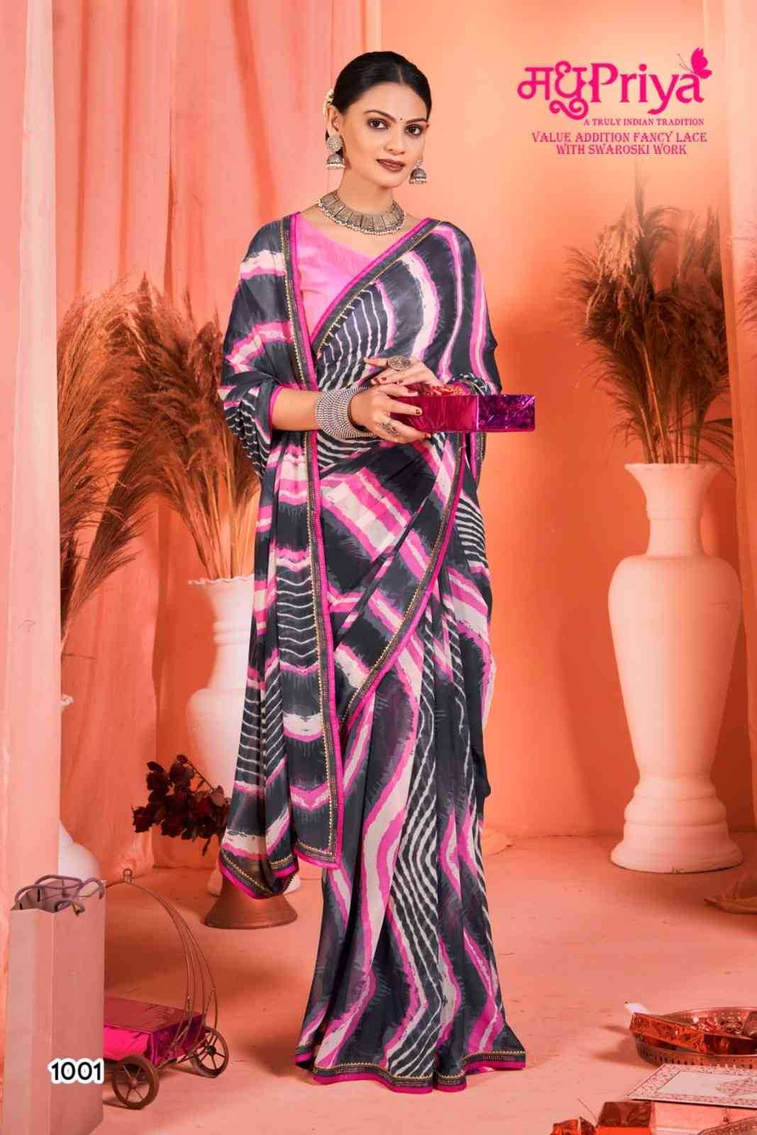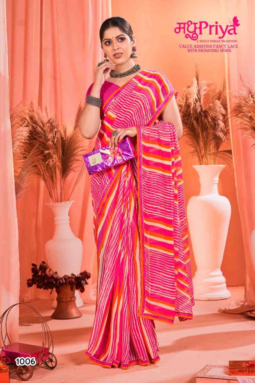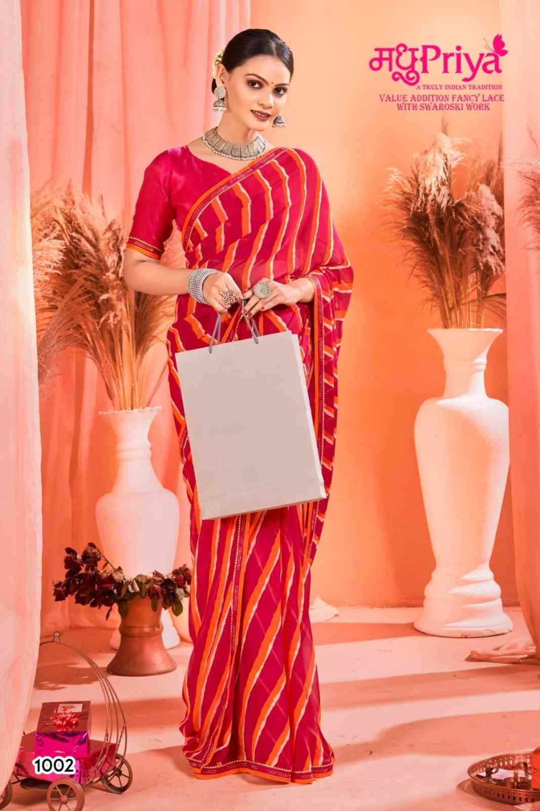 Looking for madhupriya chakori ethnic design weightless saree with blouse Full Catalouge at Best Price? Buy Now madhupriya chakori ethnic design weightless saree with blouse at Wholesale Rate of Rs 3120 with Total 8 Pcs from authroized dealer and supplier of Madhupriya Brand. Cost of Each piece is just only Rs 390 which is very low and affordable price to resale the product in your retail store. rrgandhi is Surat based Wholesale Supplier & Dealer of Madhupriya Brand. Click on Brand name to Know more about Brand's products.