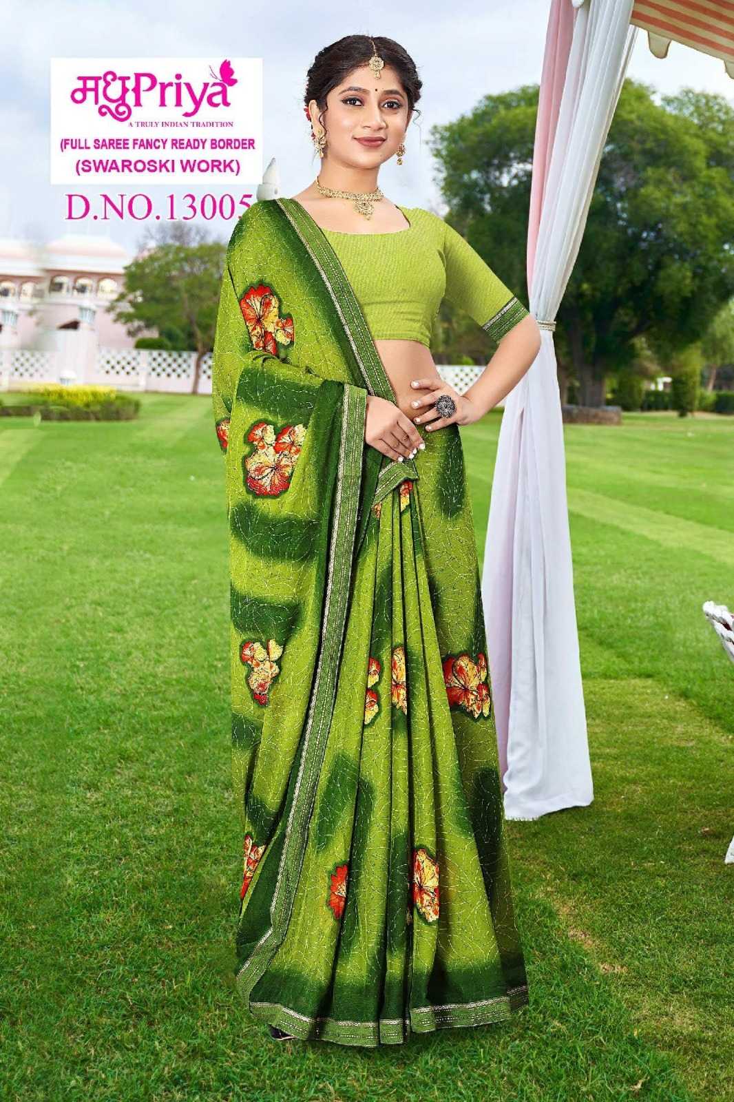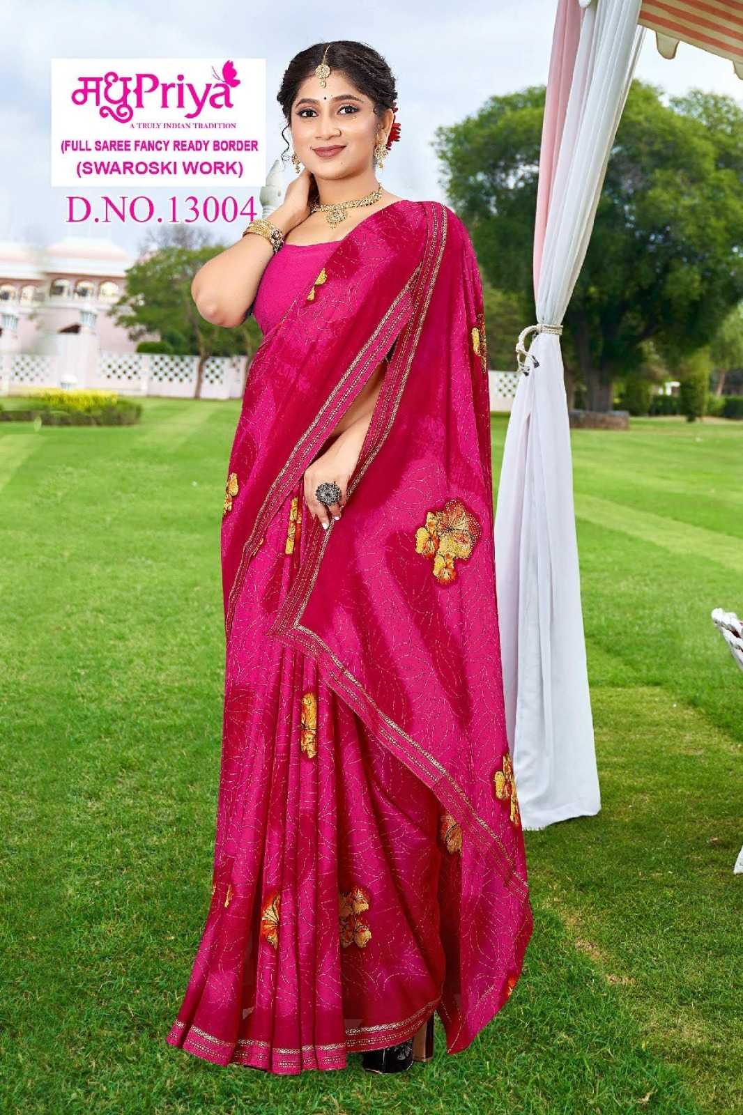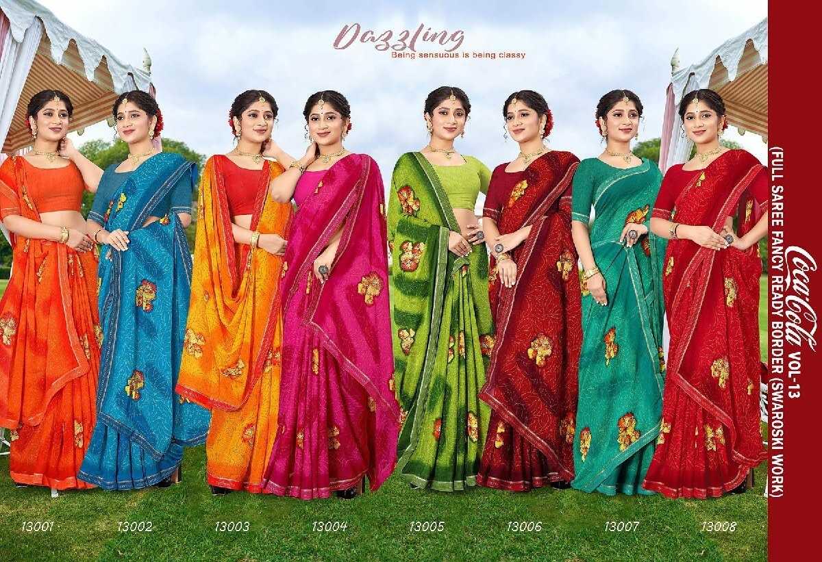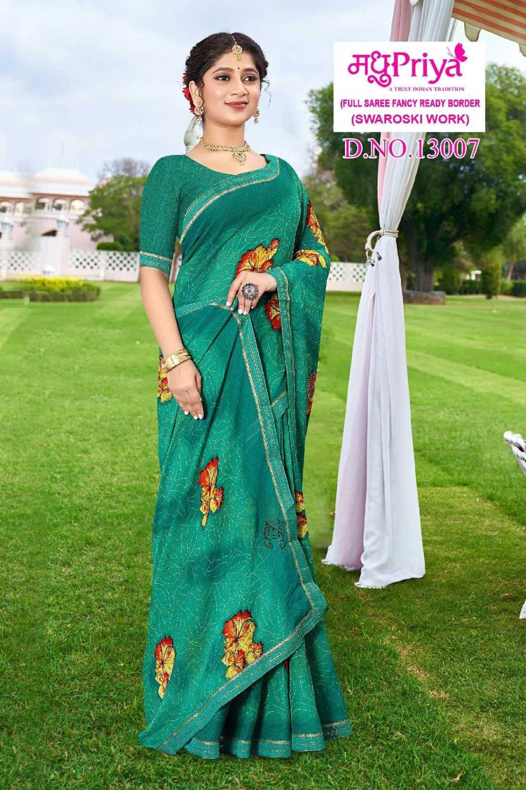 Looking for madhupriya coca cola vol 13 summer swaroski work fancy print saree Full Catalouge at Best Price? Buy Now madhupriya coca cola vol 13 summer swaroski work fancy print saree at Wholesale Rate of Rs 2000 with Total 8 Pcs from authroized dealer and supplier of Madhupriya Brand. Cost of Each piece is just only Rs 250 which is very low and affordable price to resale the product in your retail store. rrgandhi is Surat based Wholesale Supplier & Dealer of Madhupriya Brand. Click on Brand name to Know more about Brand's products.