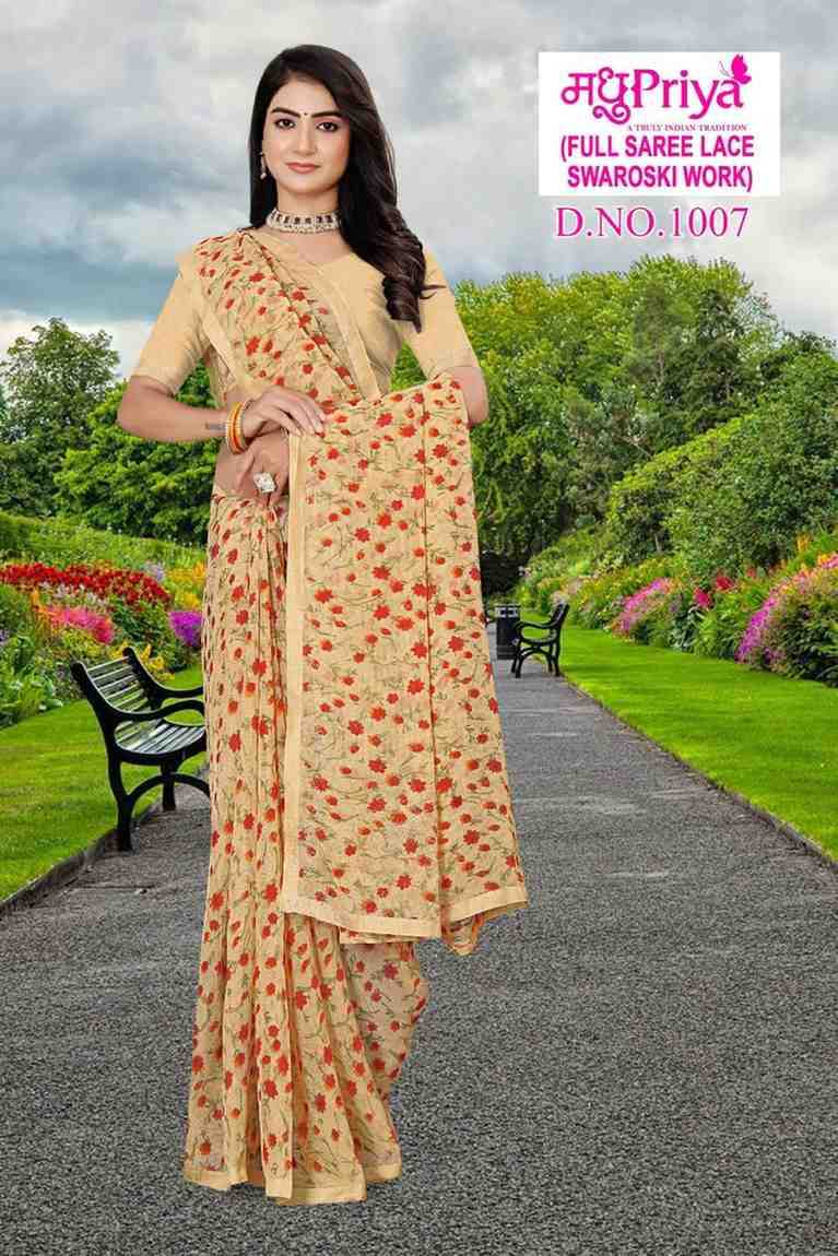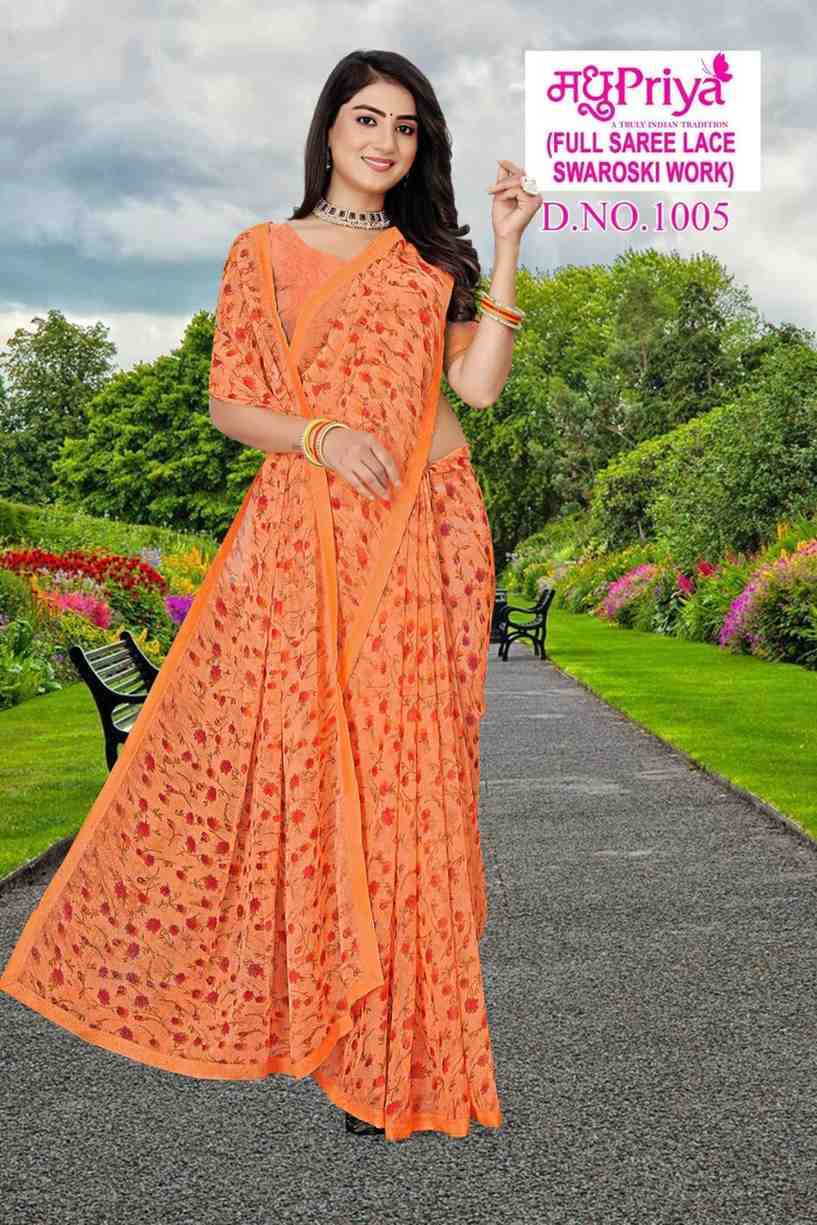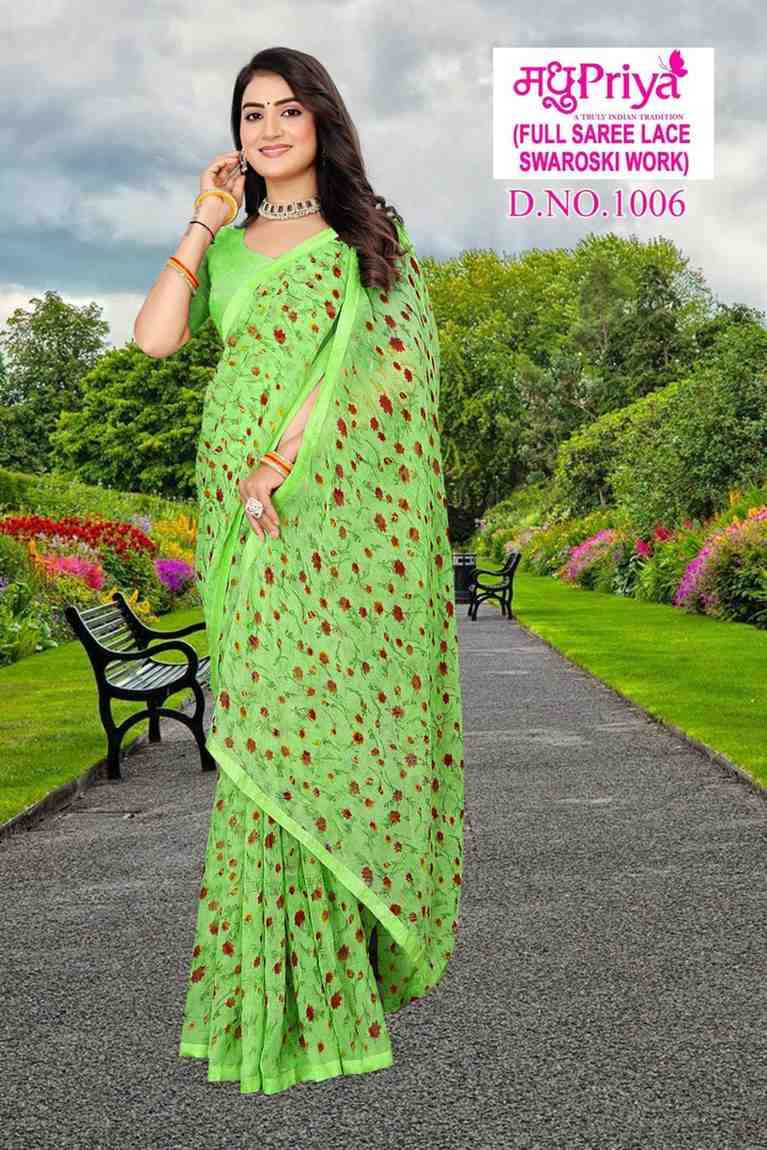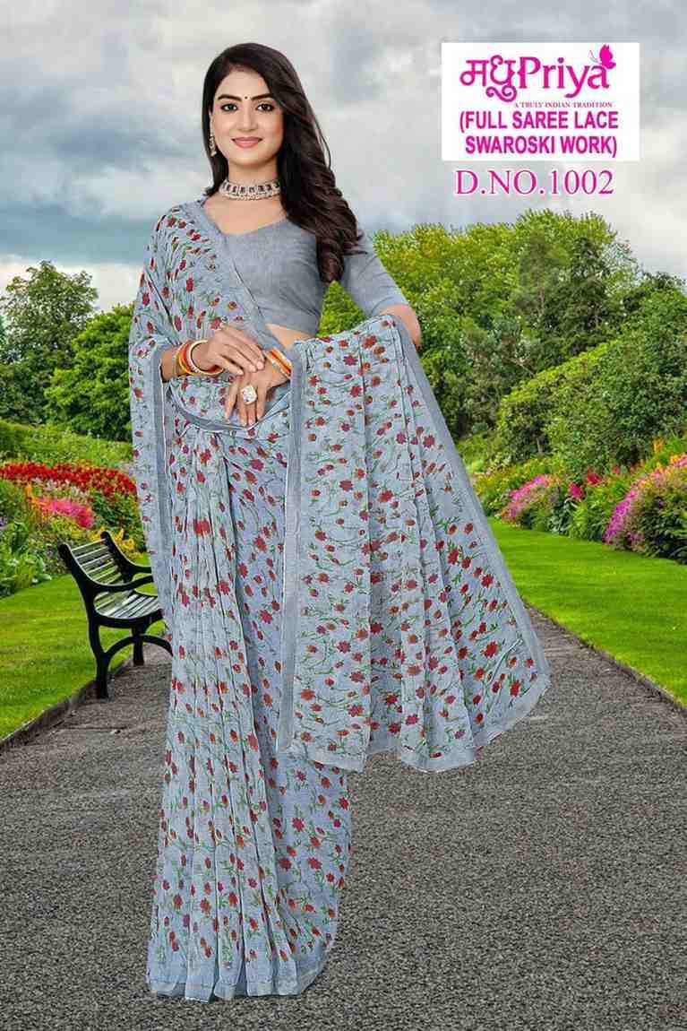 Looking for madhupriya dolly vol 10 fancy chiffon amazing work saree with blouse Full Catalouge at Best Price? Buy Now madhupriya dolly vol 10 fancy chiffon amazing work saree with blouse at Wholesale Rate of Rs 1920 with Total 8 Pcs from authroized dealer and supplier of Madhupriya Brand. Cost of Each piece is just only Rs 240 which is very low and affordable price to resale the product in your retail store. rrgandhi is Surat based Wholesale Supplier & Dealer of Madhupriya Brand. Click on Brand name to Know more about Brand's products.