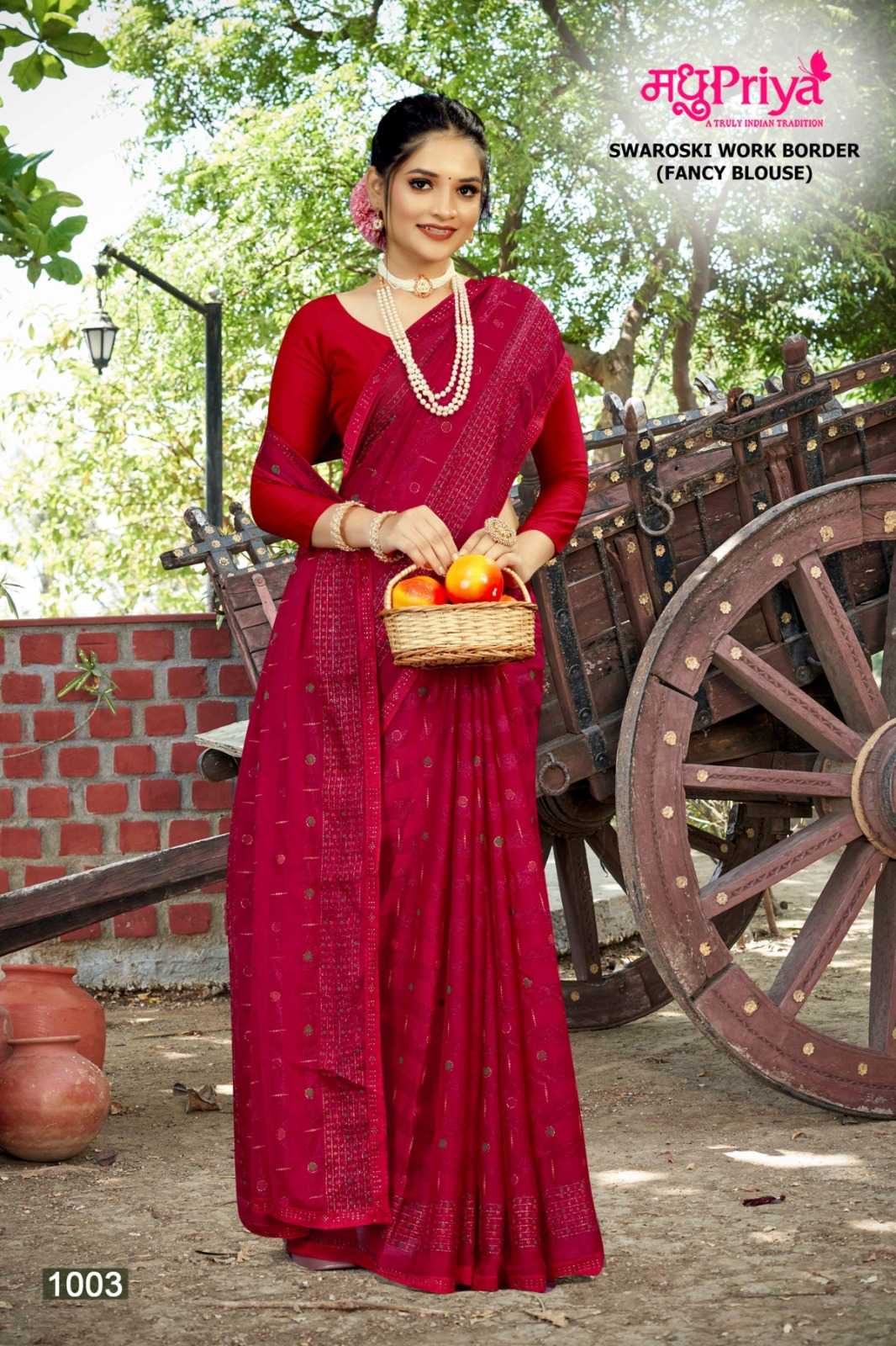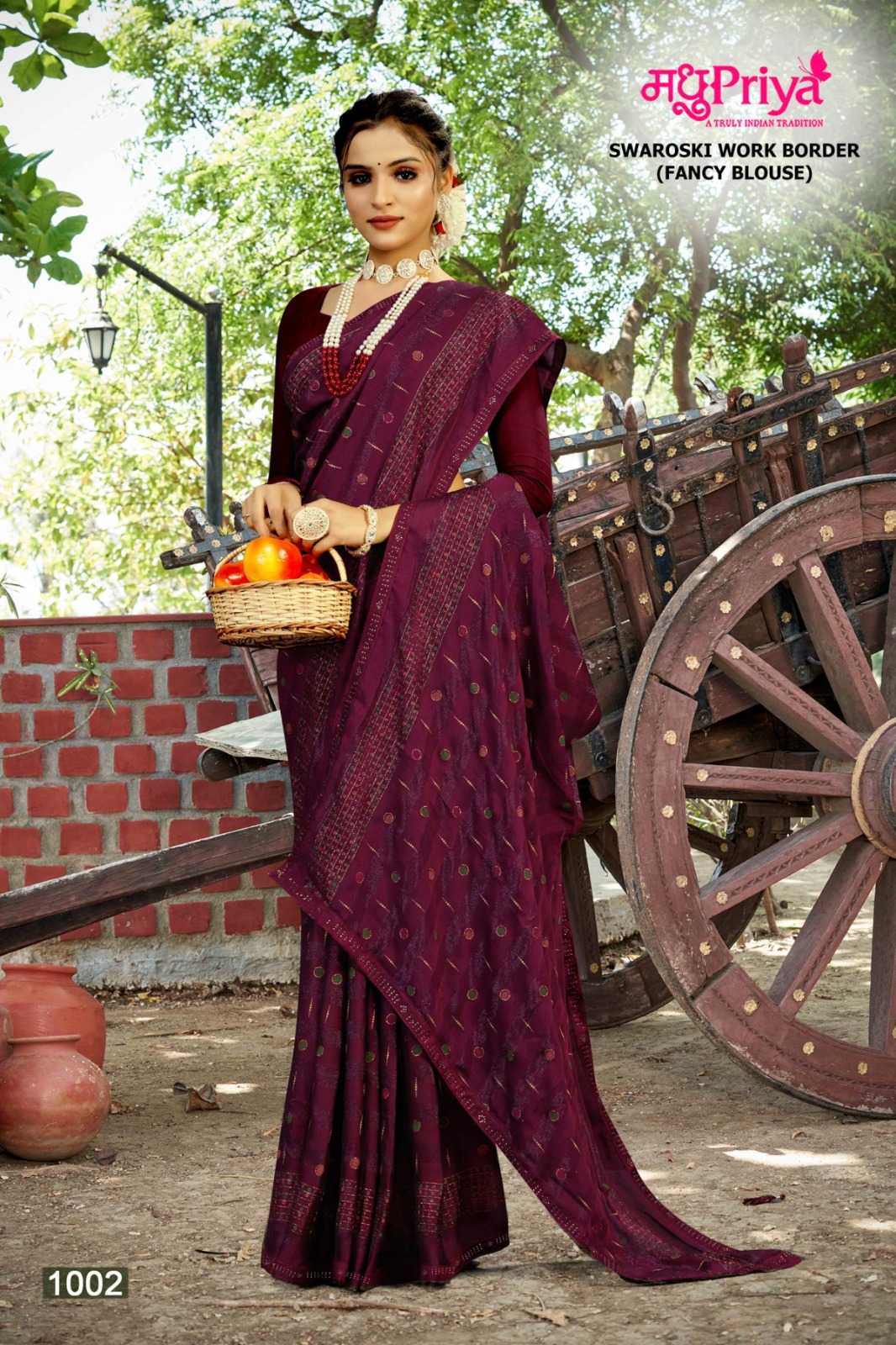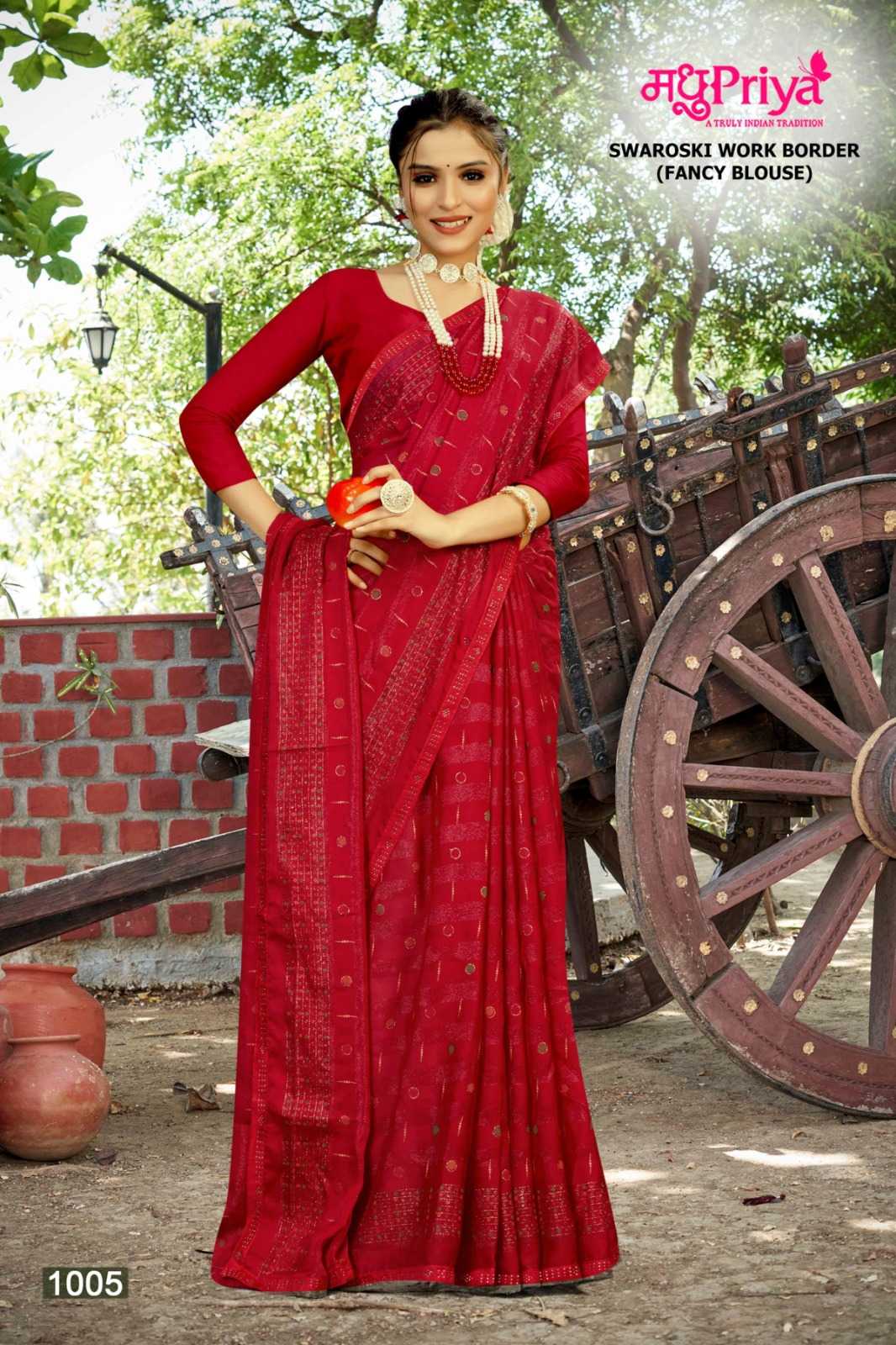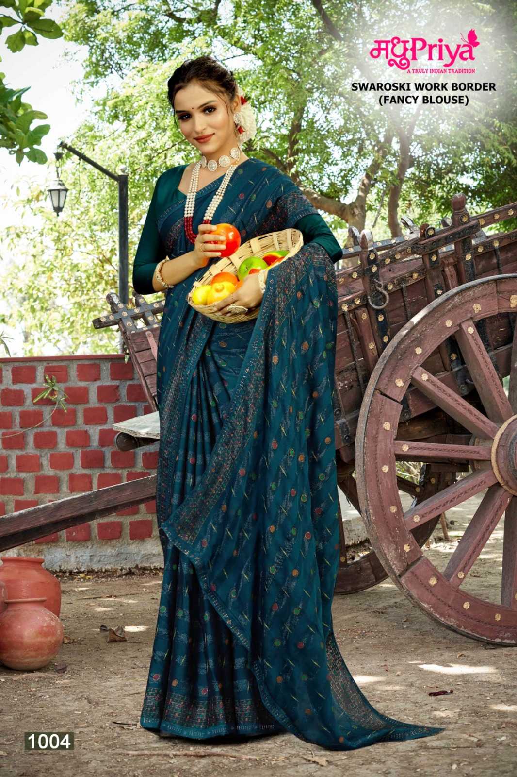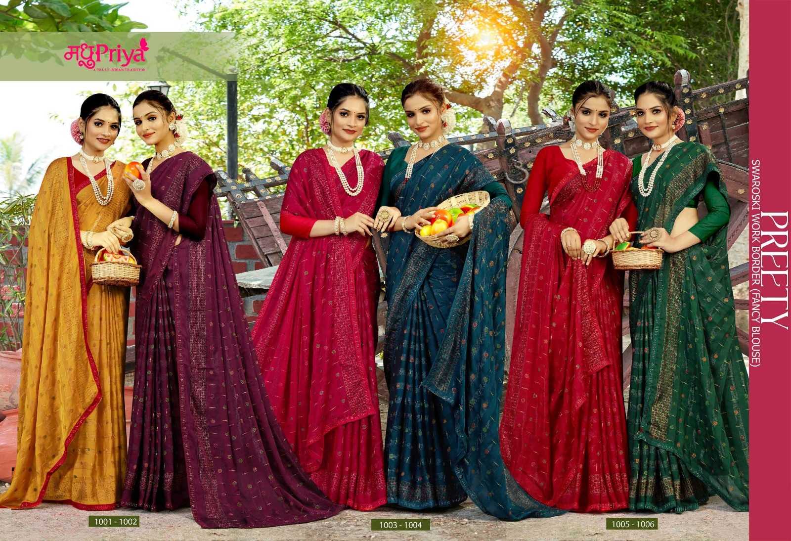 Looking for madhupriya preety rimzim pattren beautiful saree Full Catalouge at Best Price? Buy Now madhupriya preety rimzim pattren beautiful saree at Wholesale Rate of Rs 2340 with Total 6 Pcs from authroized dealer and supplier of Madhupriya Brand. Cost of Each piece is just only Rs 390 which is very low and affordable price to resale the product in your retail store. rrgandhi is Surat based Wholesale Supplier & Dealer of Madhupriya Brand. Click on Brand name to Know more about Brand's products.