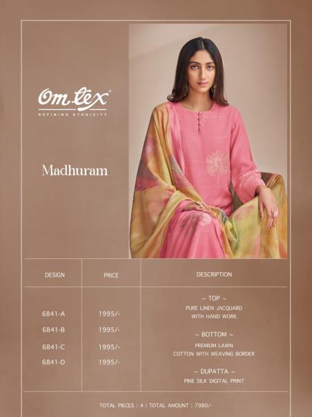 Looking for madhuram by omtex linen jacquard casual wear unstitch suit Full Catalouge at Best Price? Buy Now madhuram by omtex linen jacquard casual wear unstitch suit at Wholesale Rate of Rs 7980 with Total 4 Pcs from authroized dealer and supplier of Om Tex Brand. Cost of Each piece is just only Rs 1995 which is very low and affordable price to resale the product in your retail store. rrgandhi is Surat based Wholesale Supplier & Dealer of Om Tex Brand. Click on Brand name to Know more about Brand's products.