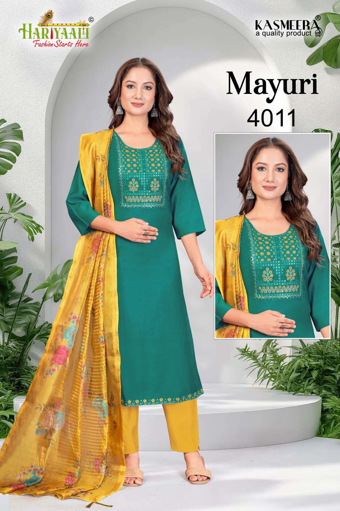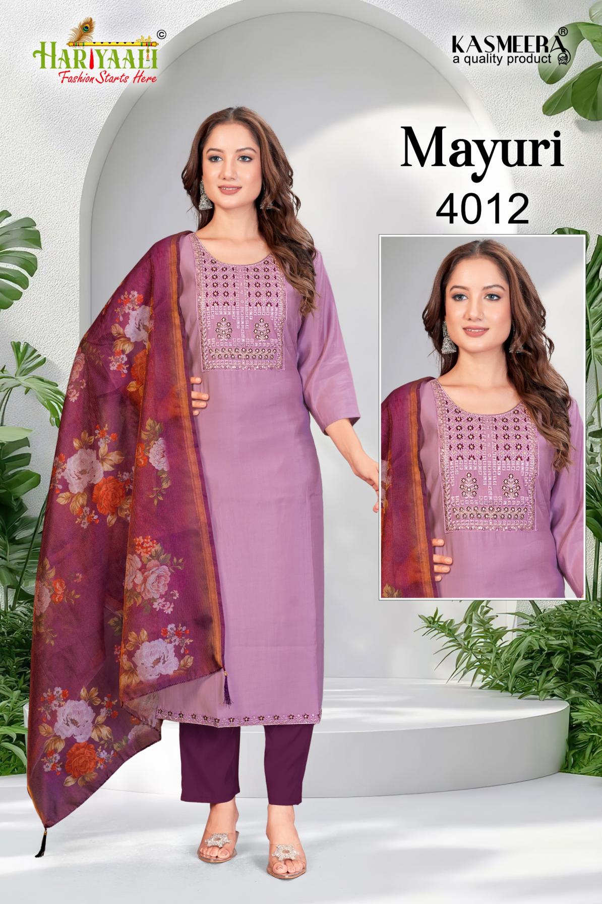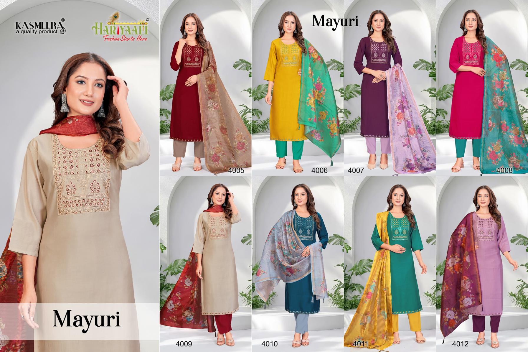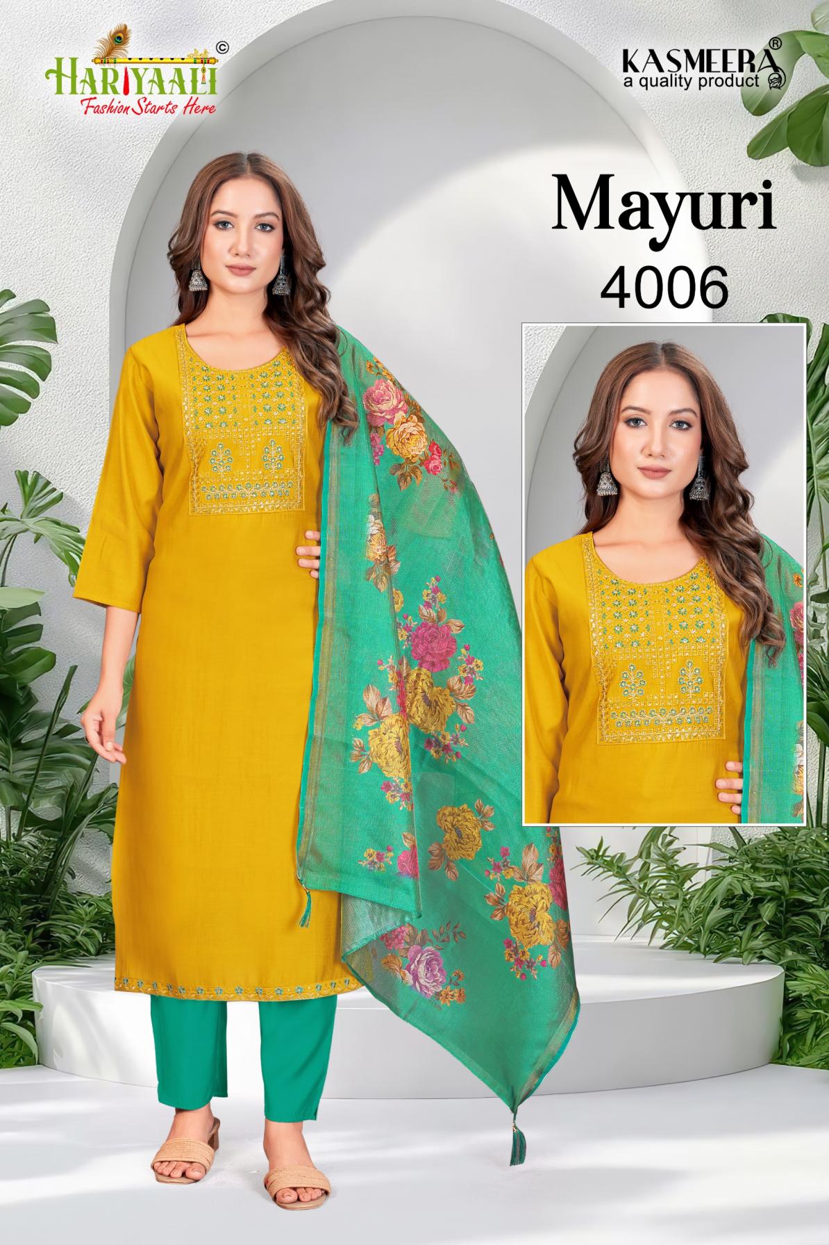 Looking for MAYURI VOL 4 BY HARIYAALI READYMADE UNIQUE SILK COMBO SALWAR SUIT Full Catalouge at Best Price? Buy Now MAYURI VOL 4 BY HARIYAALI READYMADE UNIQUE SILK COMBO SALWAR SUIT at Wholesale Rate of Rs 33200 with Total 40 Pcs from authroized dealer and supplier of Hariyaali Brand. Cost of Each piece is just only Rs 830 which is very low and affordable price to resale the product in your retail store. rrgandhi is Surat based Wholesale Supplier & Dealer of Hariyaali Brand. Click on Brand name to Know more about Brand's products.