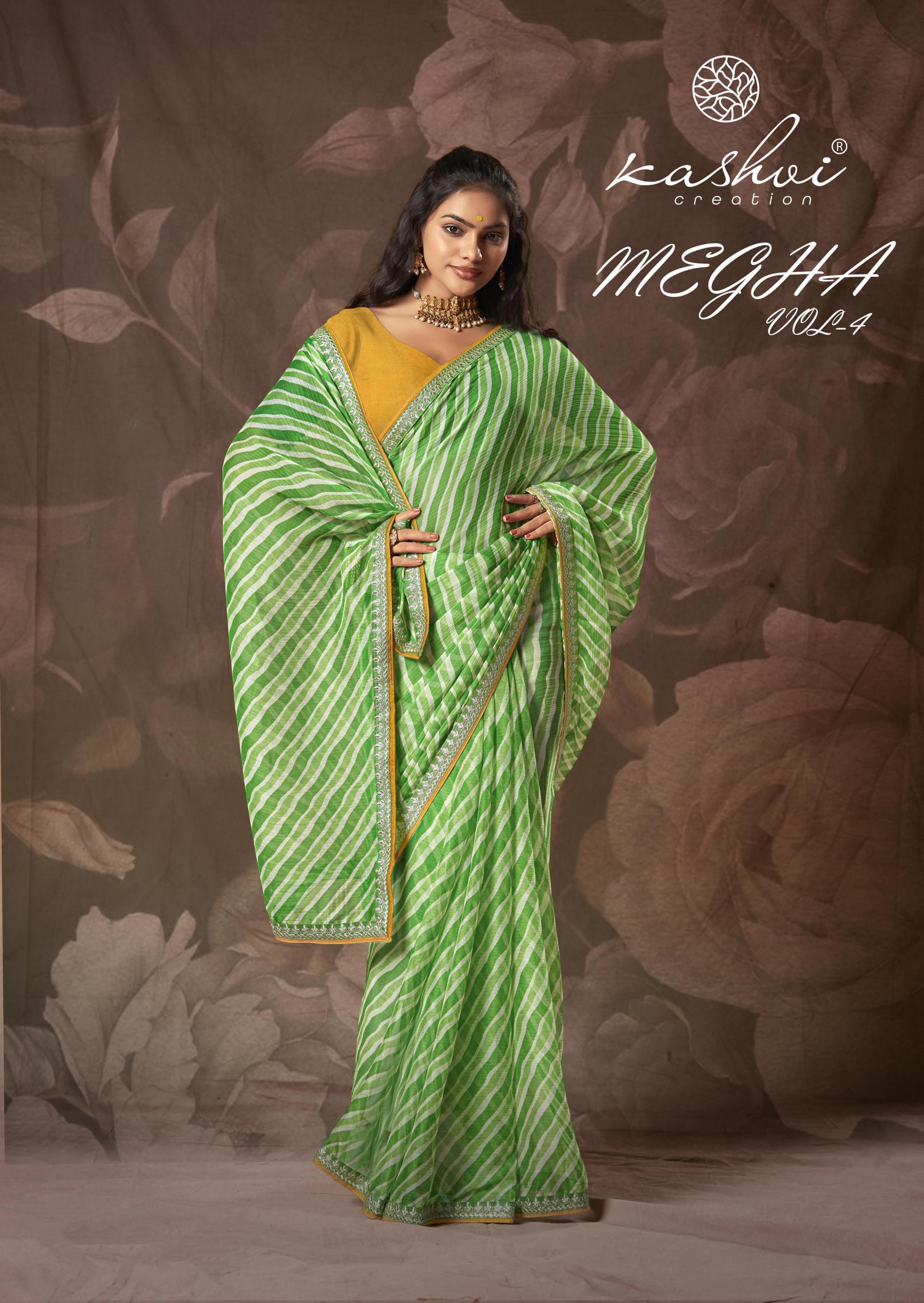 Looking for MEGHA VOL 4 BY KASHVI CREATION PRINTED SAREES Full Catalouge at Best Price? Buy Now MEGHA VOL 4 BY KASHVI CREATION PRINTED SAREES at Wholesale Rate of Rs 4840 with Total 8 Pcs from authroized dealer and supplier of Kashvi Creation Brand. Cost of Each piece is just only Rs 605 which is very low and affordable price to resale the product in your retail store. rrgandhi is Surat based Wholesale Supplier & Dealer of Kashvi Creation Brand. Click on Brand name to Know more about Brand's products.