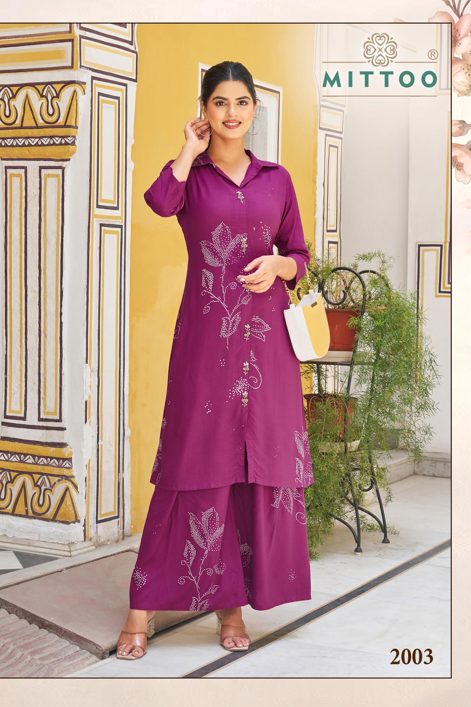 Looking for MITTOO INDRANI RAYON FULL STITCH STYLISH CO-ORD FOR GIRLS Full Catalouge at Best Price? Buy Now MITTOO INDRANI RAYON FULL STITCH STYLISH CO-ORD FOR GIRLS at Wholesale Rate of Rs 3160 with Total 4 Pcs from authroized dealer and supplier of Mittoo Brand. Cost of Each piece is just only Rs 790 which is very low and affordable price to resale the product in your retail store. rrgandhi is Surat based Wholesale Supplier & Dealer of Mittoo Brand. Click on Brand name to Know more about Brand's products.