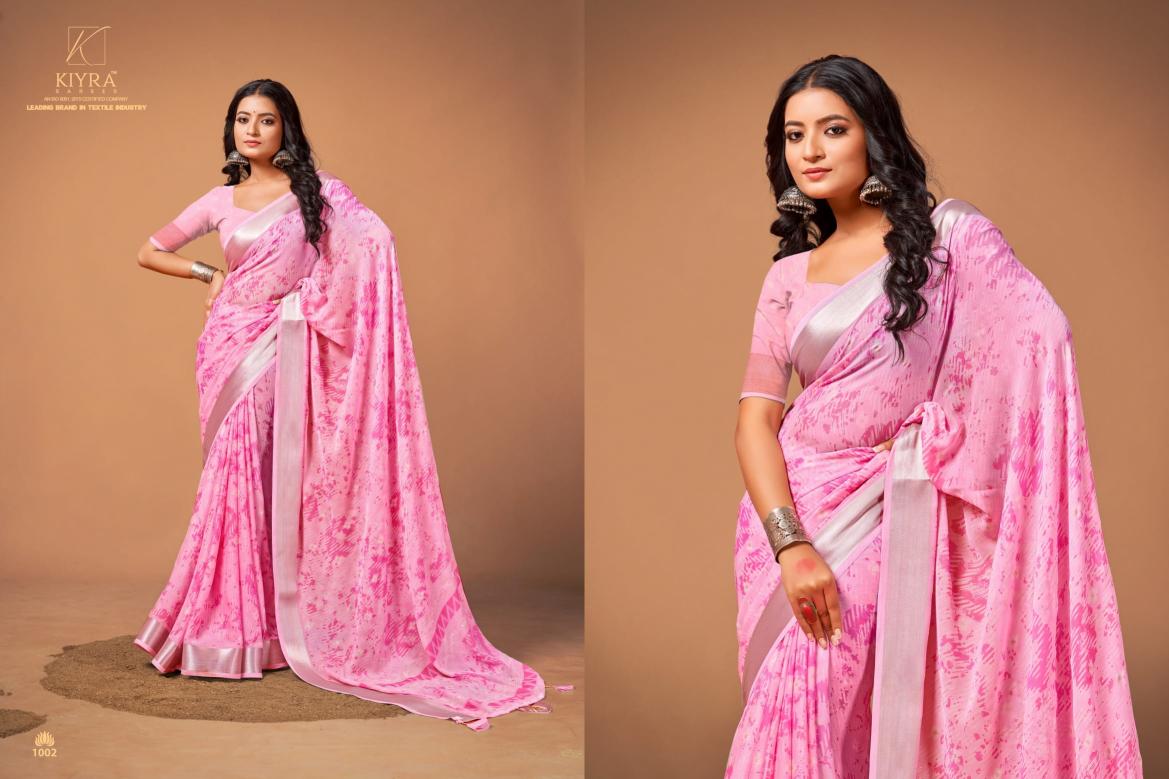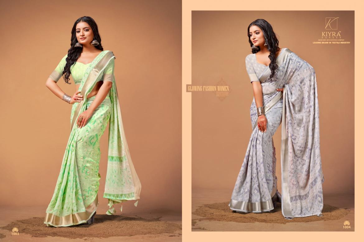 Looking for niharika vol 1 by kiyra traditional wear fancy womens saree Full Catalouge at Best Price? Buy Now niharika vol 1 by kiyra traditional wear fancy womens saree at Wholesale Rate of Rs 3425 with Total 5 Pcs from authroized dealer and supplier of Kiyra Sarees Brand. Cost of Each piece is just only Rs 685 which is very low and affordable price to resale the product in your retail store. rrgandhi is Surat based Wholesale Supplier & Dealer of Kiyra Sarees Brand. Click on Brand name to Know more about Brand's products.