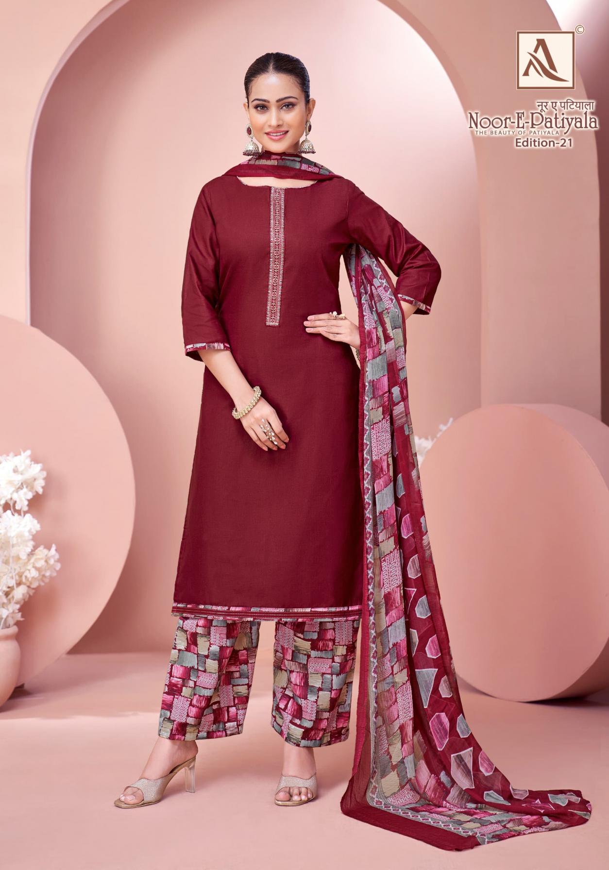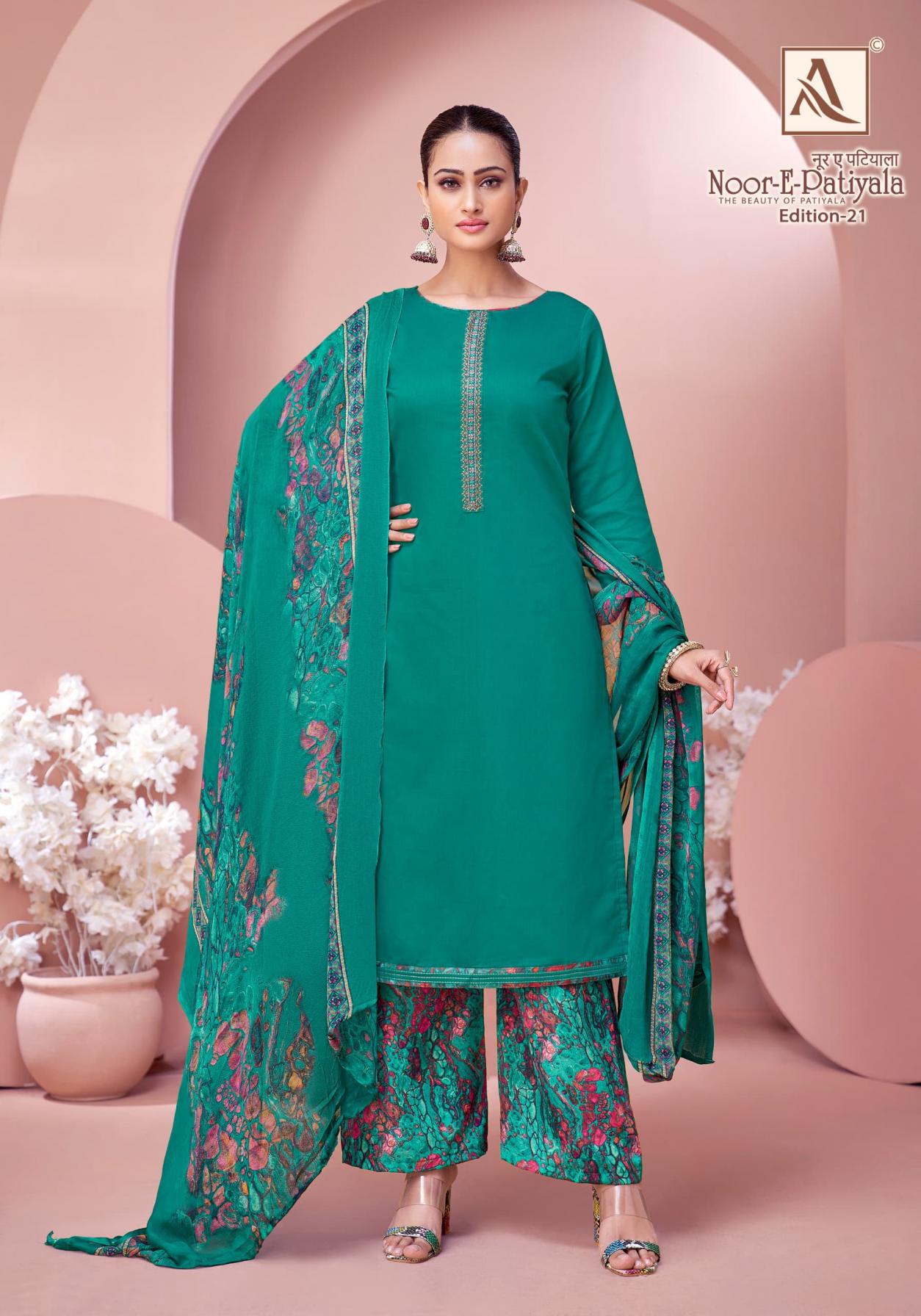 Looking for noor e patiyala vol 21 by alok zam dyed hit design pakistani suits Full Catalouge at Best Price? Buy Now noor e patiyala vol 21 by alok zam dyed hit design pakistani suits at Wholesale Rate of Rs 3992 with Total 8 Pcs from authroized dealer and supplier of Alok Suit Brand. Cost of Each piece is just only Rs 499 which is very low and affordable price to resale the product in your retail store. rrgandhi is Surat based Wholesale Supplier & Dealer of Alok Suit Brand. Click on Brand name to Know more about Brand's products.