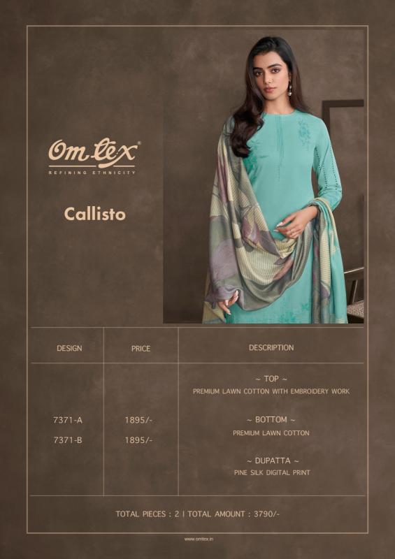 Looking for omtex callisto lawn cotton elegant style dress material Full Catalouge at Best Price? Buy Now omtex callisto lawn cotton elegant style dress material at Wholesale Rate of Rs 3790 with Total 2 Pcs from authroized dealer and supplier of Om Tex Brand. Cost of Each piece is just only Rs 1895 which is very low and affordable price to resale the product in your retail store. rrgandhi is Surat based Wholesale Supplier & Dealer of Om Tex Brand. Click on Brand name to Know more about Brand's products.