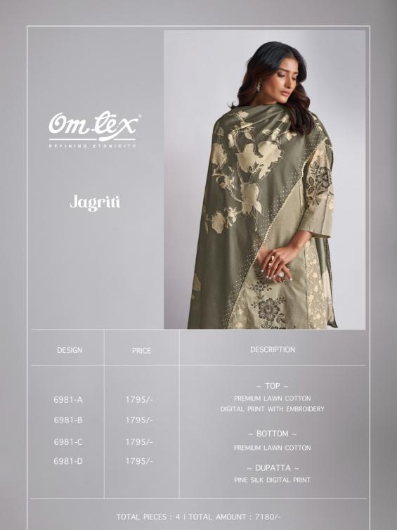 Looking for omtex jagriti lawn cotton hit design unstitch suit for ladies Full Catalouge at Best Price? Buy Now omtex jagriti lawn cotton hit design unstitch suit for ladies at Wholesale Rate of Rs 7180 with Total 4 Pcs from authroized dealer and supplier of Om Tex Brand. Cost of Each piece is just only Rs 1795 which is very low and affordable price to resale the product in your retail store. rrgandhi is Surat based Wholesale Supplier & Dealer of Om Tex Brand. Click on Brand name to Know more about Brand's products.