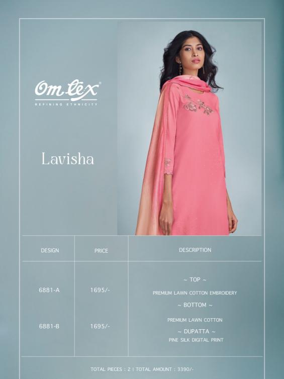 Looking for omtex lavisha popular design lawn cotton dress material online Full Catalouge at Best Price? Buy Now omtex lavisha popular design lawn cotton dress material online at Wholesale Rate of Rs 3390 with Total 2 Pcs from authroized dealer and supplier of Om Tex Brand. Cost of Each piece is just only Rs 1695 which is very low and affordable price to resale the product in your retail store. rrgandhi is Surat based Wholesale Supplier & Dealer of Om Tex Brand. Click on Brand name to Know more about Brand's products.