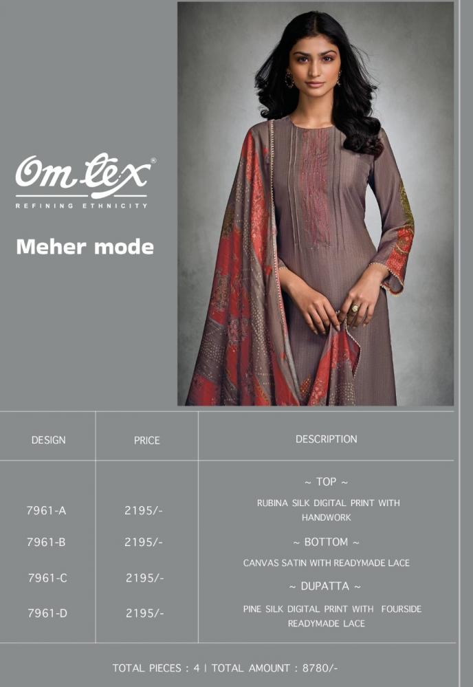 Looking for OMTEX MEHER MODE RUBINA SILK DAILY WEAR SALWAR KAMEEZ Full Catalouge at Best Price? Buy Now OMTEX MEHER MODE RUBINA SILK DAILY WEAR SALWAR KAMEEZ at Wholesale Rate of Rs 8780 with Total 4 Pcs from authroized dealer and supplier of Om Tex Brand. Cost of Each piece is just only Rs 2195 which is very low and affordable price to resale the product in your retail store. rrgandhi is Surat based Wholesale Supplier & Dealer of Om Tex Brand. Click on Brand name to Know more about Brand's products.