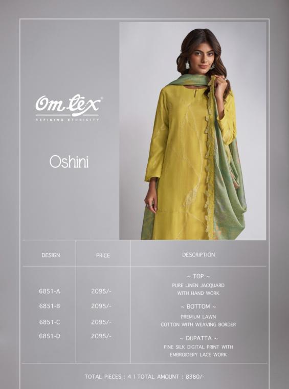 Looking for omtex oshini linen jacquard pretty look dress material Full Catalouge at Best Price? Buy Now omtex oshini linen jacquard pretty look dress material at Wholesale Rate of Rs 8380 with Total 4 Pcs from authroized dealer and supplier of Om Tex Brand. Cost of Each piece is just only Rs 2095 which is very low and affordable price to resale the product in your retail store. rrgandhi is Surat based Wholesale Supplier & Dealer of Om Tex Brand. Click on Brand name to Know more about Brand's products.