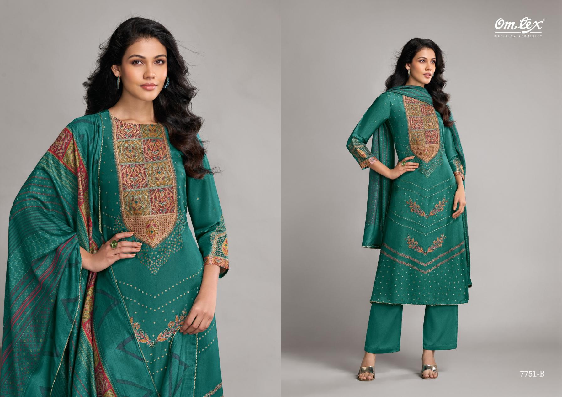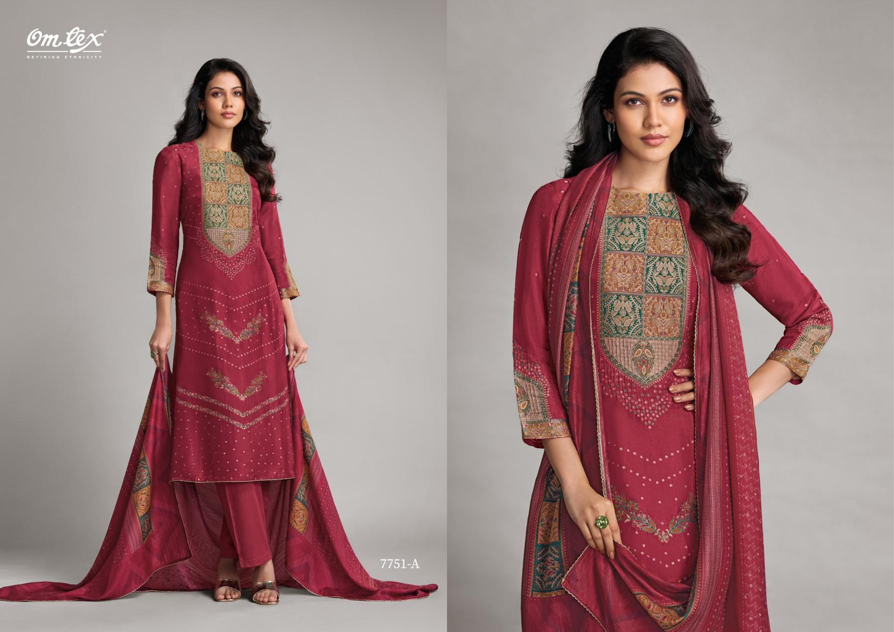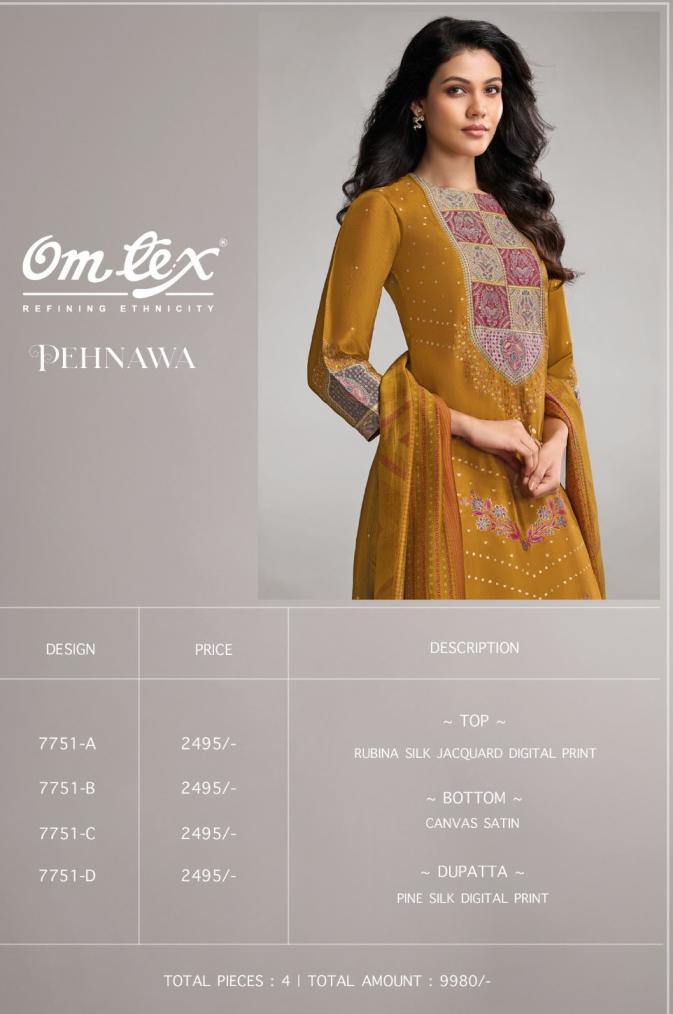 Looking for OMTEX PEHNAWA RUBINA SILK JACQUARD CLASSIC LOOK SALWAR KAMEEZ Full Catalouge at Best Price? Buy Now OMTEX PEHNAWA RUBINA SILK JACQUARD CLASSIC LOOK SALWAR KAMEEZ at Wholesale Rate of Rs 9980 with Total 4 Pcs from authroized dealer and supplier of Om Tex Brand. Cost of Each piece is just only Rs 2495 which is very low and affordable price to resale the product in your retail store. rrgandhi is Surat based Wholesale Supplier & Dealer of Om Tex Brand. Click on Brand name to Know more about Brand's products.