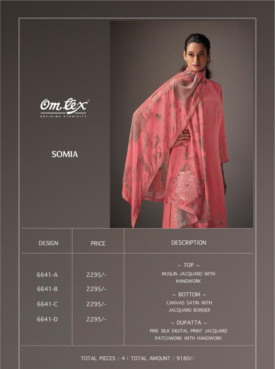 Looking for omtex somia muslin jacquard designer salwar suit sets online Full Catalouge at Best Price? Buy Now omtex somia muslin jacquard designer salwar suit sets online at Wholesale Rate of Rs 9180 with Total 4 Pcs from authroized dealer and supplier of Om Tex Brand. Cost of Each piece is just only Rs 2295 which is very low and affordable price to resale the product in your retail store. rrgandhi is Surat based Wholesale Supplier & Dealer of Om Tex Brand. Click on Brand name to Know more about Brand's products.
