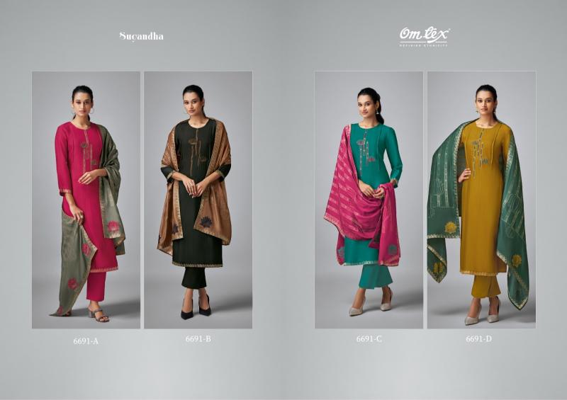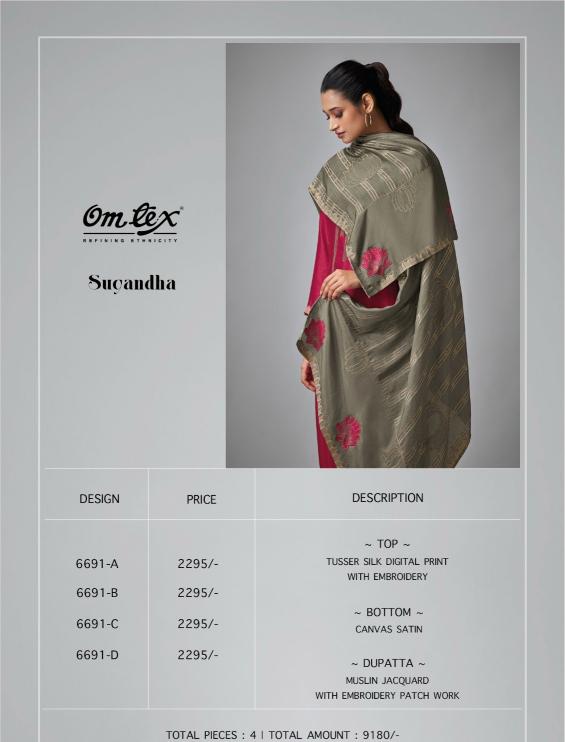 Looking for omtex sugandha elegance style tusser silk dress material Full Catalouge at Best Price? Buy Now omtex sugandha elegance style tusser silk dress material at Wholesale Rate of Rs 9180 with Total 4 Pcs from authroized dealer and supplier of Om Tex Brand. Cost of Each piece is just only Rs 2295 which is very low and affordable price to resale the product in your retail store. rrgandhi is Surat based Wholesale Supplier & Dealer of Om Tex Brand. Click on Brand name to Know more about Brand's products.