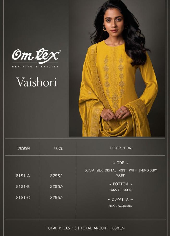 Looking for OMTEX VAISHORI OLIVA SILK ELEGANT STYLE DRESS MATERIALS Full Catalouge at Best Price? Buy Now OMTEX VAISHORI OLIVA SILK ELEGANT STYLE DRESS MATERIALS at Wholesale Rate of Rs 6885 with Total 3 Pcs from authroized dealer and supplier of Om Tex Brand. Cost of Each piece is just only Rs 2295 which is very low and affordable price to resale the product in your retail store. rrgandhi is Surat based Wholesale Supplier & Dealer of Om Tex Brand. Click on Brand name to Know more about Brand's products.
