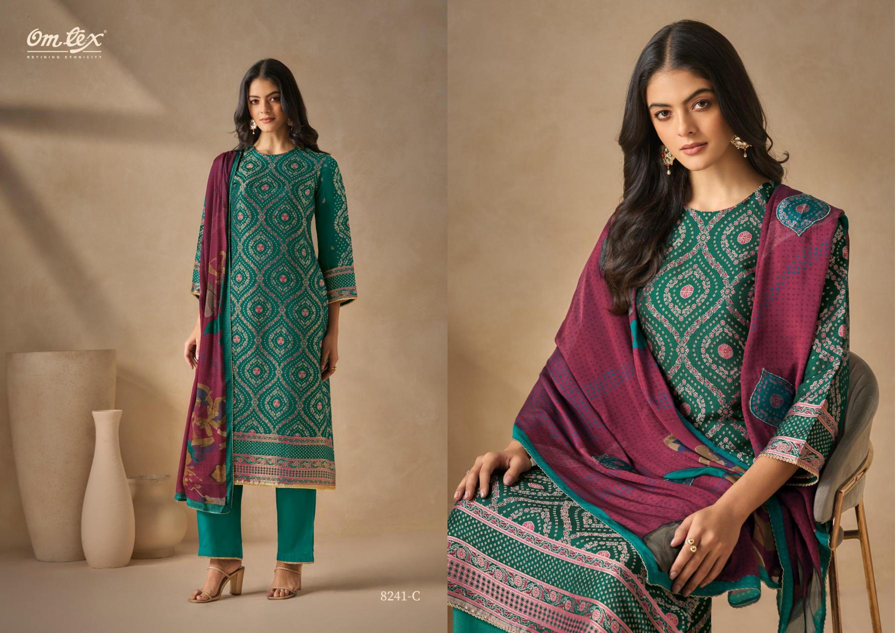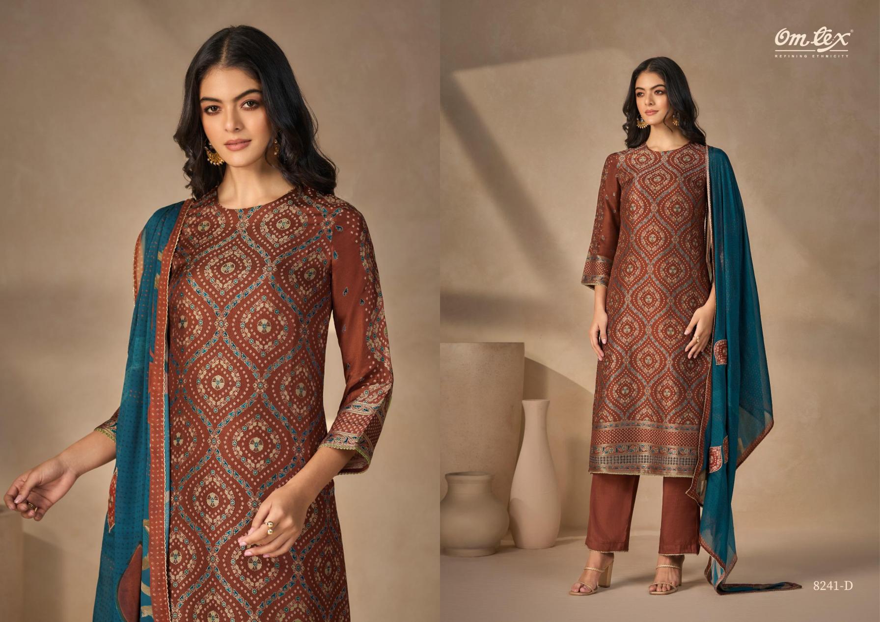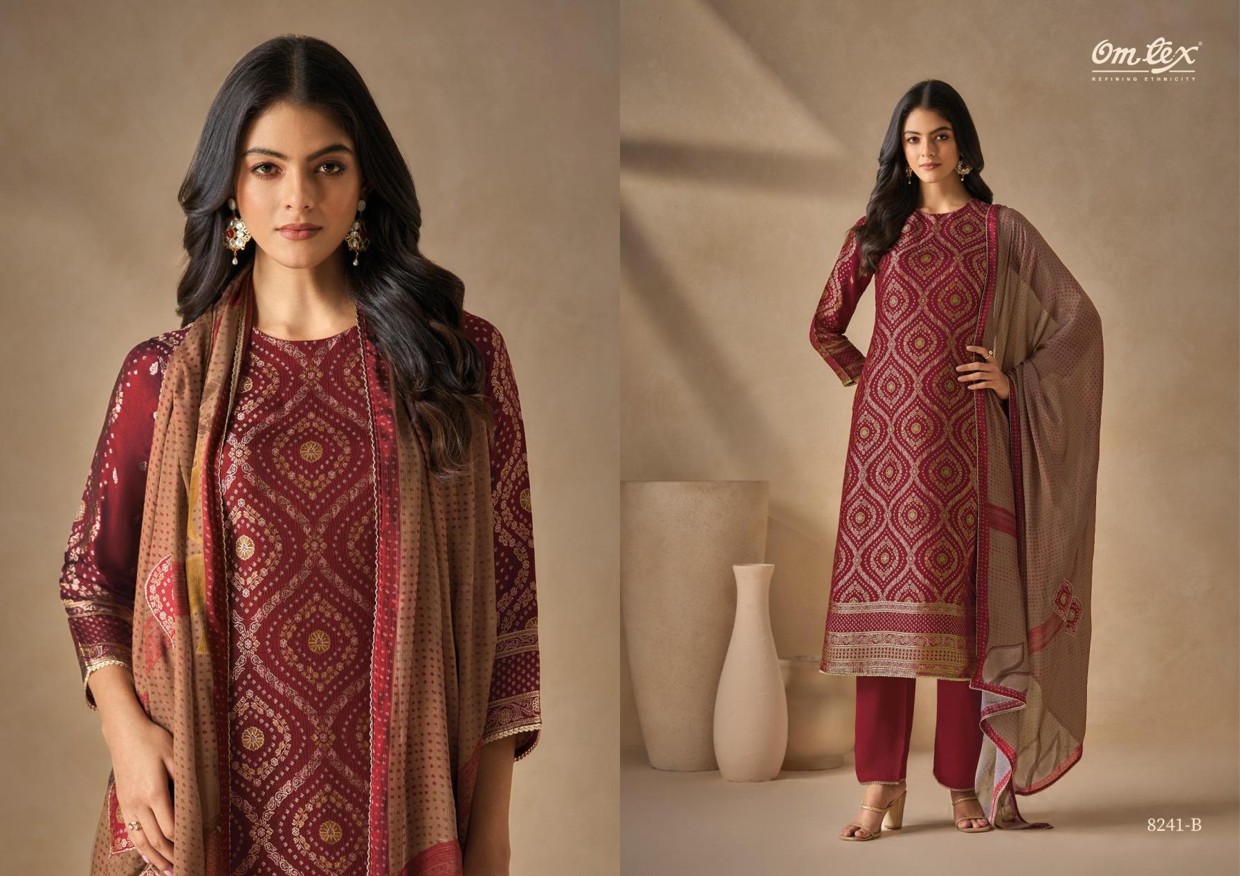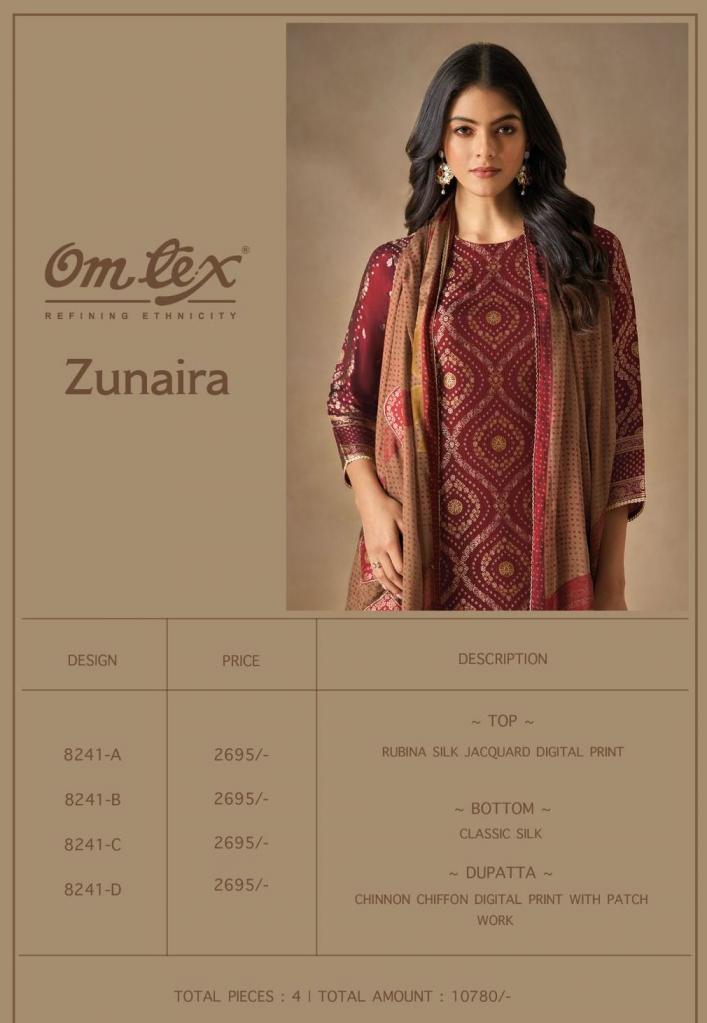 Looking for OMTEX ZUNAIRA RUBINA SILK JACQUARD BEST WHOLESALE RATES Full Catalouge at Best Price? Buy Now OMTEX ZUNAIRA RUBINA SILK JACQUARD BEST WHOLESALE RATES at Wholesale Rate of Rs 10780 with Total 4 Pcs from authroized dealer and supplier of Om Tex Brand. Cost of Each piece is just only Rs 2695 which is very low and affordable price to resale the product in your retail store. rrgandhi is Surat based Wholesale Supplier & Dealer of Om Tex Brand. Click on Brand name to Know more about Brand's products.