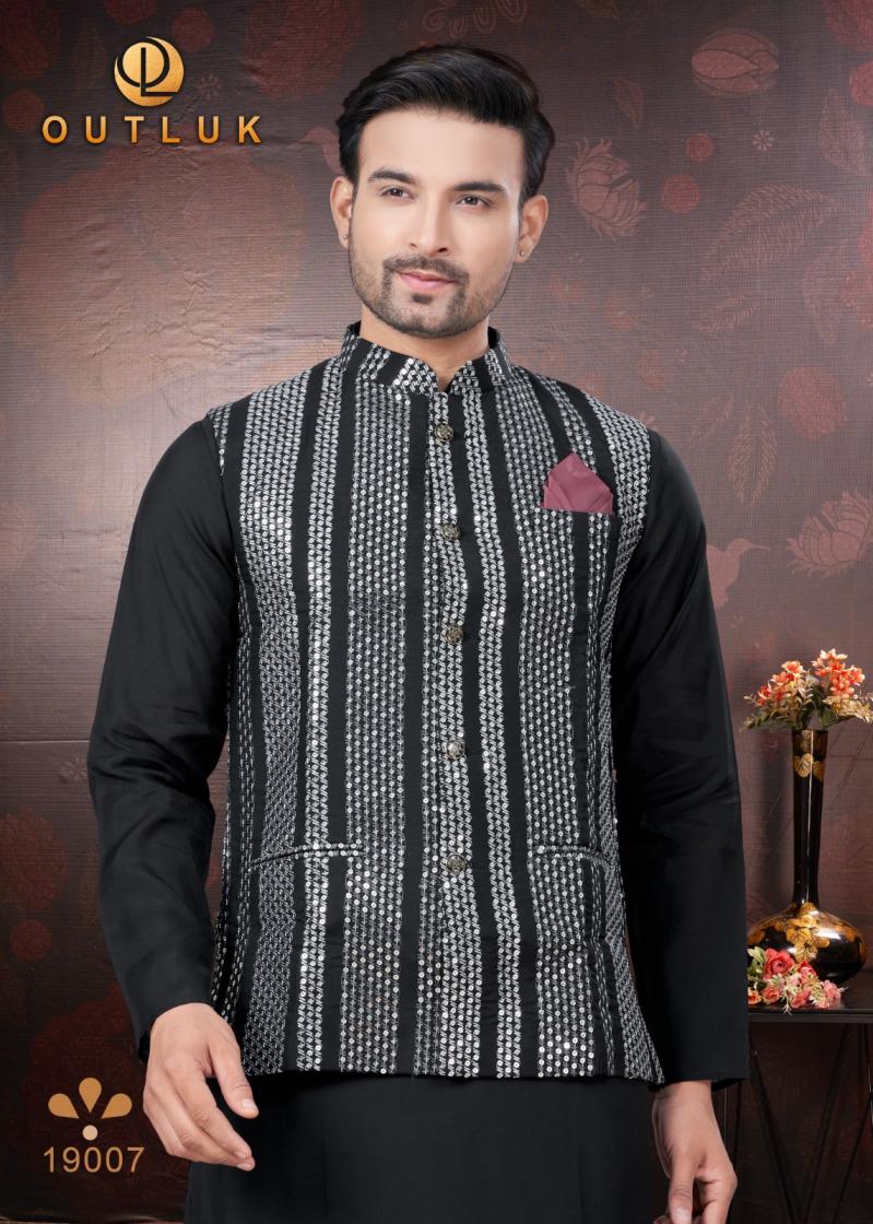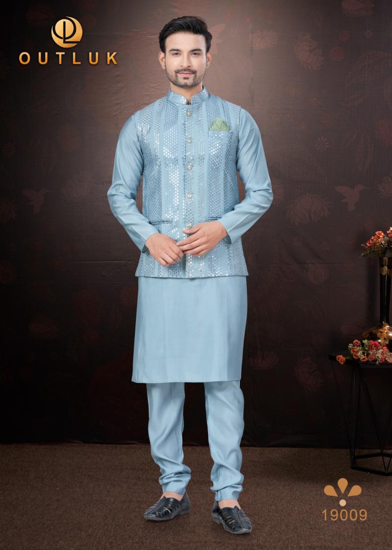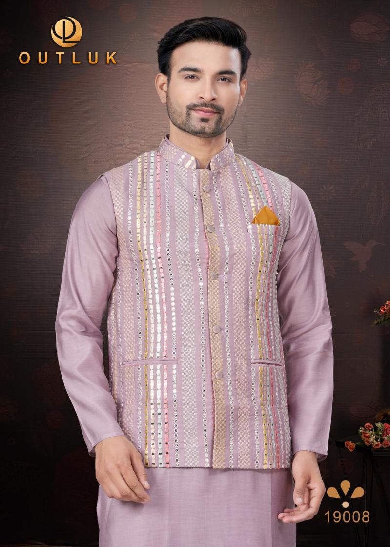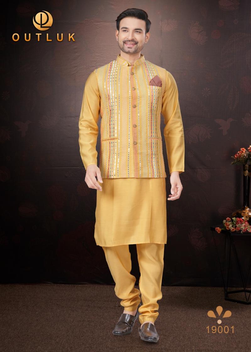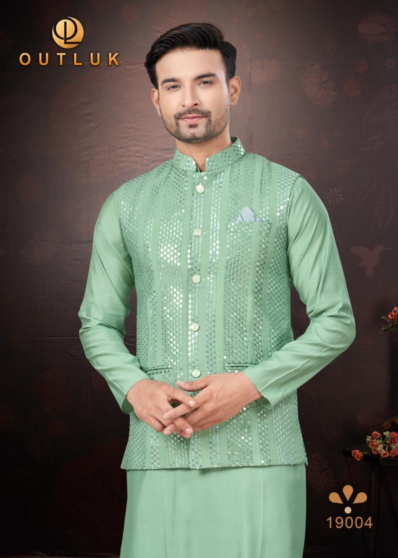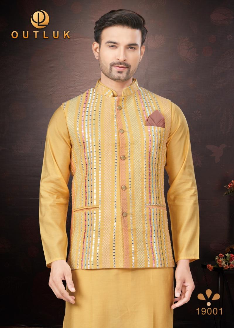 Looking for OUTLUK SILK WEDDING COLLECTION VOL 19 TRENDY FULL STITCH MENS KOTI KURTA WITH PAJAMA Full Catalouge at Best Price? Buy Now OUTLUK SILK WEDDING COLLECTION VOL 19 TRENDY FULL STITCH MENS KOTI KURTA WITH PAJAMA at Wholesale Rate of Rs 16155 with Total 9 Pcs from authroized dealer and supplier of Outluk Brand. Cost of Each piece is just only Rs 1795 which is very low and affordable price to resale the product in your retail store. rrgandhi is Surat based Wholesale Supplier & Dealer of Outluk Brand. Click on Brand name to Know more about Brand's products.
