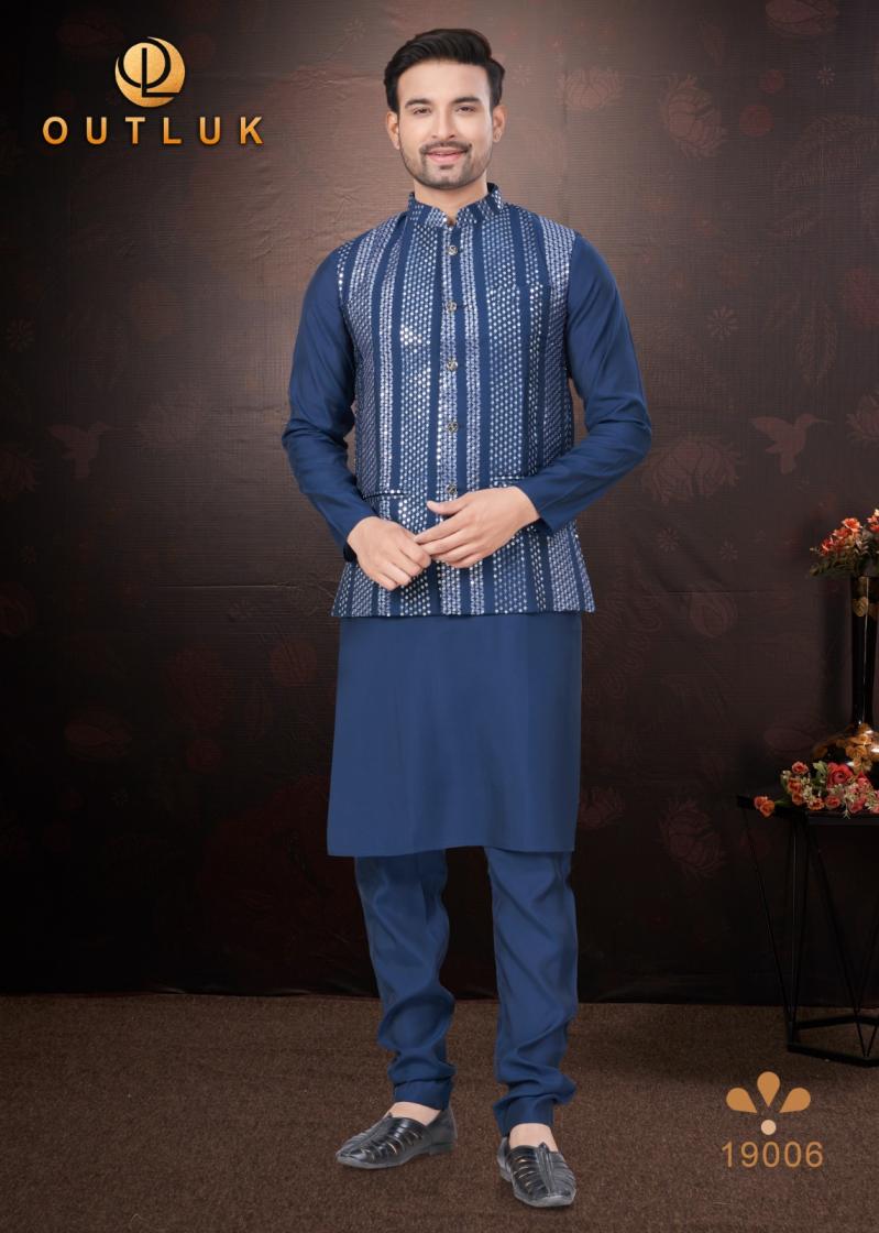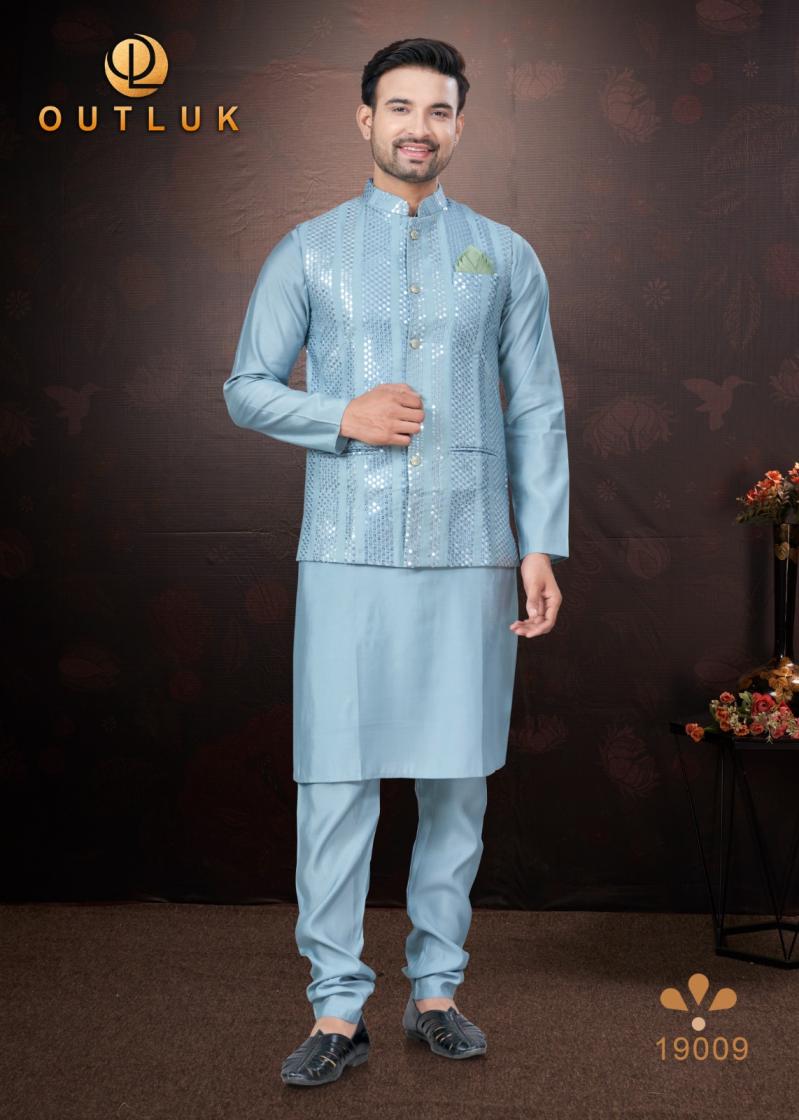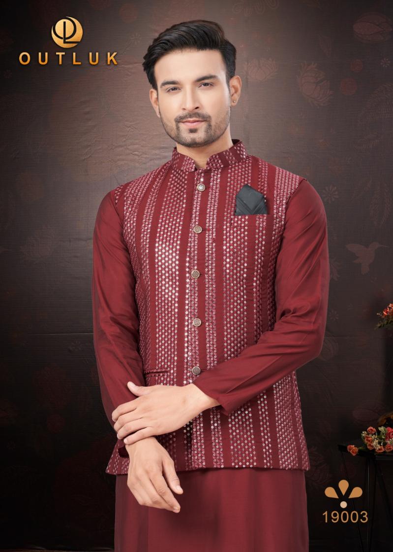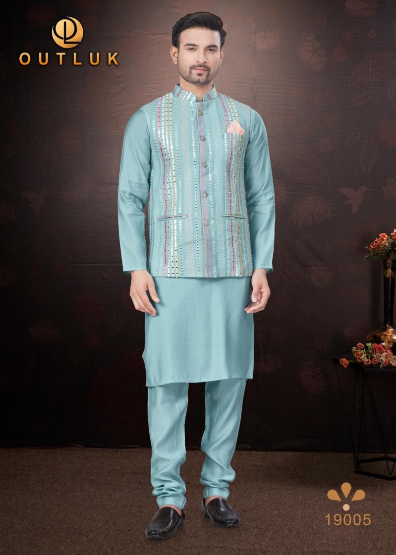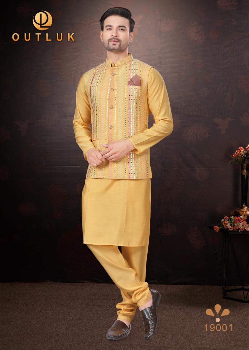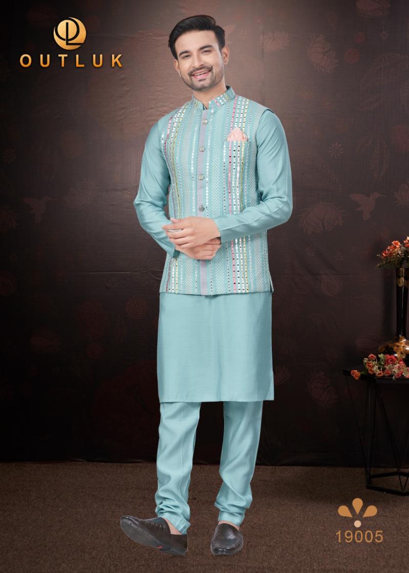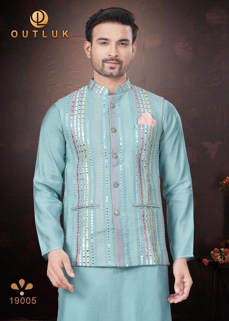 Looking for OUTLUK SILK WEDDING COLLECTION VOL 19 TRENDY FULL STITCH MENS KOTI KURTA WITH PAJAMA Full Catalouge at Best Price? Buy Now OUTLUK SILK WEDDING COLLECTION VOL 19 TRENDY FULL STITCH MENS KOTI KURTA WITH PAJAMA at Wholesale Rate of Rs 16155 with Total 9 Pcs from authroized dealer and supplier of Outluk Brand. Cost of Each piece is just only Rs 1795 which is very low and affordable price to resale the product in your retail store. rrgandhi is Surat based Wholesale Supplier & Dealer of Outluk Brand. Click on Brand name to Know more about Brand's products.