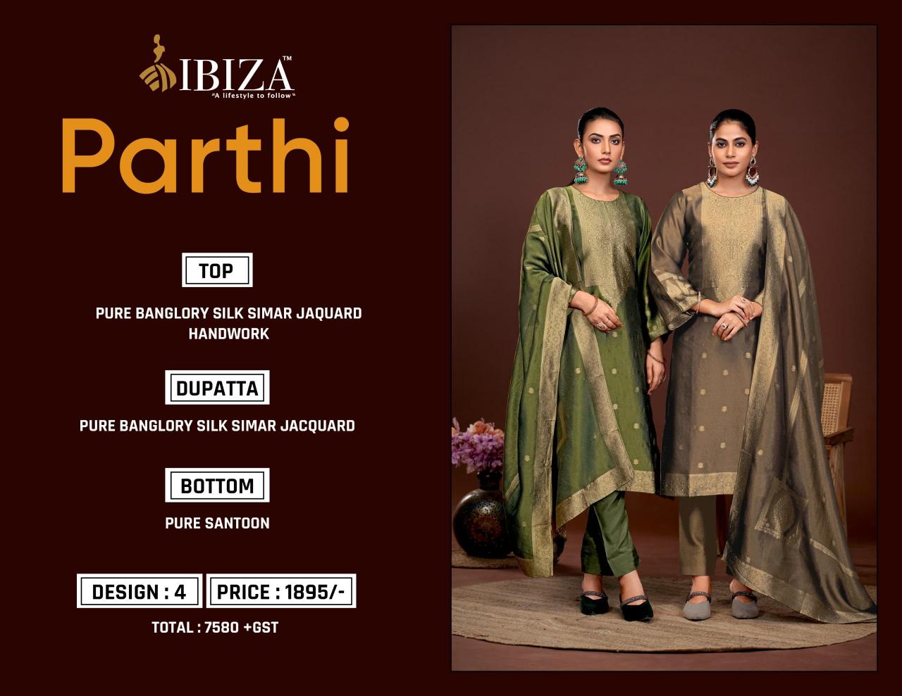Looking for PARTHI BY IBIZA CLASSY LOOK SALWAR SUITS SELLESR IN SURAT Full Catalouge at Best Price? Buy Now PARTHI BY IBIZA CLASSY LOOK SALWAR SUITS SELLESR IN SURAT at Wholesale Rate of Rs 7580 with Total 4 Pcs from authroized dealer and supplier of Ibiza Suit Brand. Cost of Each piece is just only Rs 1895 which is very low and affordable price to resale the product in your retail store. rrgandhi is Surat based Wholesale Supplier & Dealer of Ibiza Suit Brand. Click on Brand name to Know more about Brand's products.