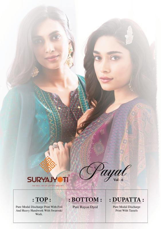 Looking for payal vol 6 by suryajyoti discharge print unique colours dress material online Full Catalouge at Best Price? Buy Now payal vol 6 by suryajyoti discharge print unique colours dress material online at Wholesale Rate of Rs 4830 with Total 6 Pcs from authroized dealer and supplier of Suryajyoti Cotton Brand. Cost of Each piece is just only Rs 805 which is very low and affordable price to resale the product in your retail store. rrgandhi is Surat based Wholesale Supplier & Dealer of Suryajyoti Cotton Brand. Click on Brand name to Know more about Brand's products.