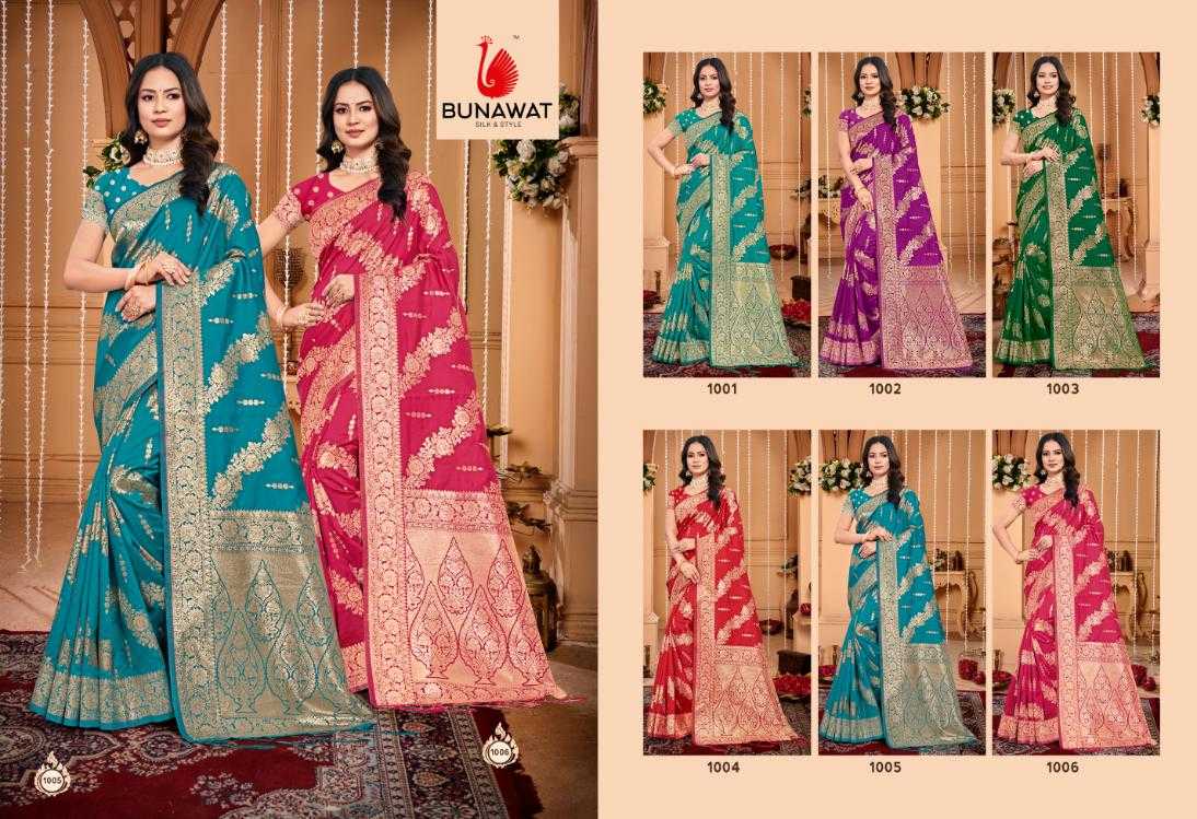 Looking for PLAZZO SILK VOL 01 BY BUNAWAT ZARI WEAVING SILK SARIS WHOLSALER Full Catalouge at Best Price? Buy Now PLAZZO SILK VOL 01 BY BUNAWAT ZARI WEAVING SILK SARIS WHOLSALER at Wholesale Rate of Rs 4794 with Total 6 Pcs from authroized dealer and supplier of Bunawat Brand. Cost of Each piece is just only Rs 799 which is very low and affordable price to resale the product in your retail store. rrgandhi is Surat based Wholesale Supplier & Dealer of Bunawat Brand. Click on Brand name to Know more about Brand's products.