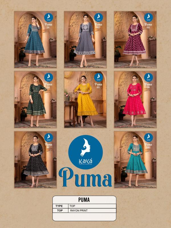 Looking for puma by kaya beautiful fullstitch frock style rayon kurti Full Catalouge at Best Price? Buy Now puma by kaya beautiful fullstitch frock style rayon kurti at Wholesale Rate of Rs 4200 with Total 8 Pcs from authroized dealer and supplier of Kaya Brand. Cost of Each piece is just only Rs 525 which is very low and affordable price to resale the product in your retail store. rrgandhi is Surat based Wholesale Supplier & Dealer of Kaya Brand. Click on Brand name to Know more about Brand's products.