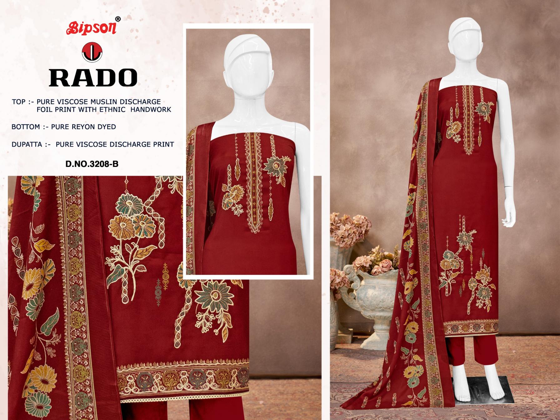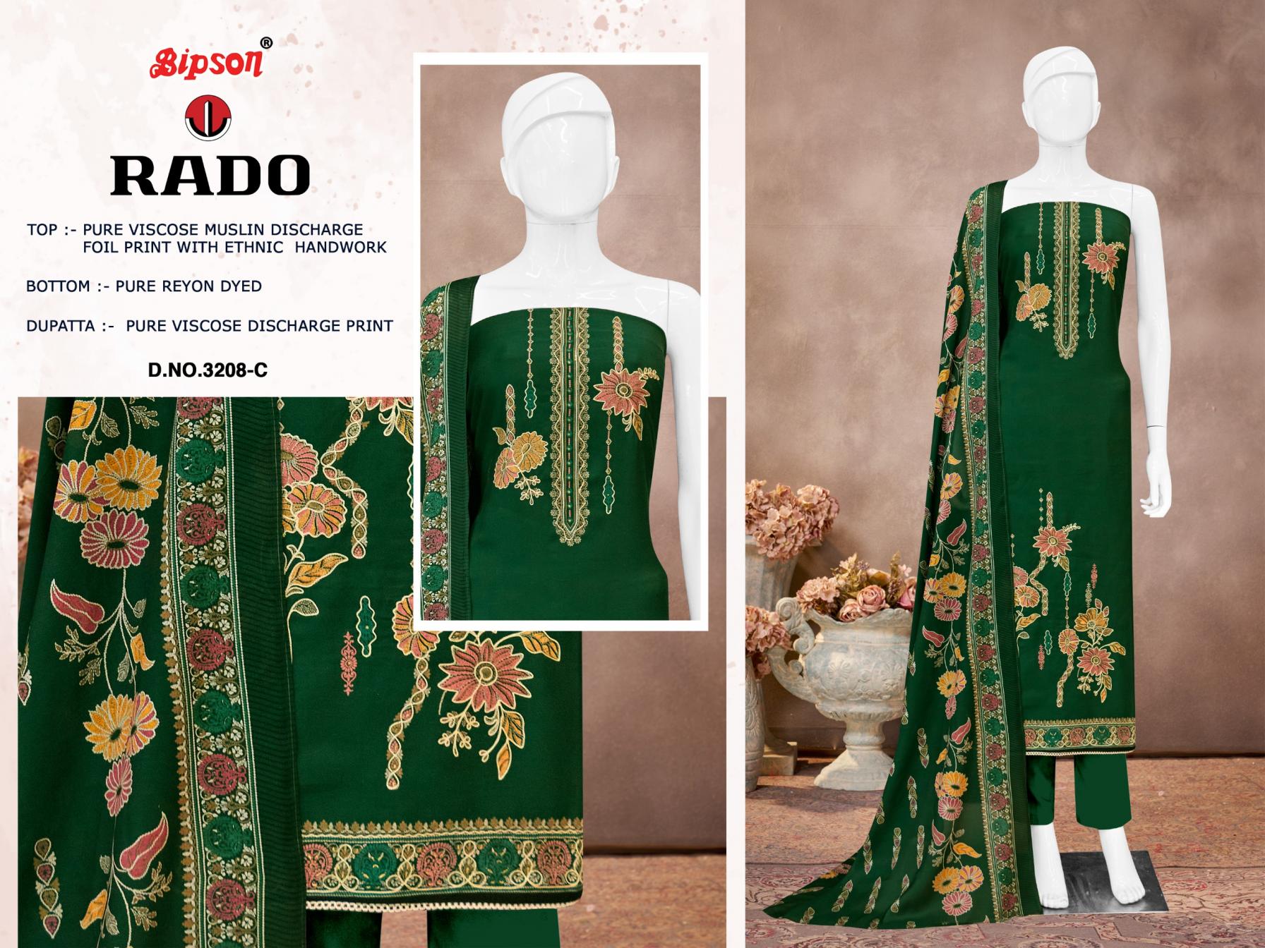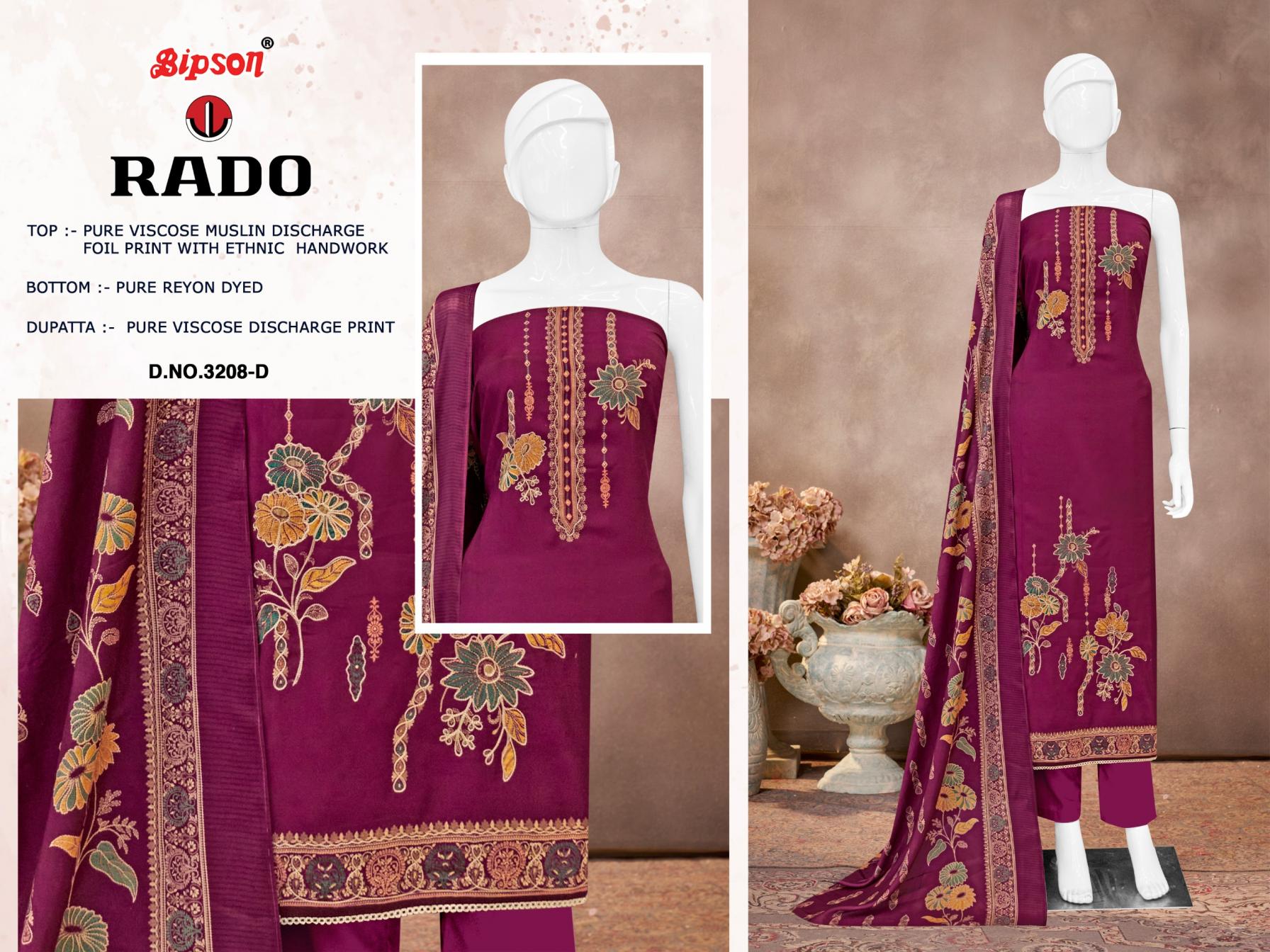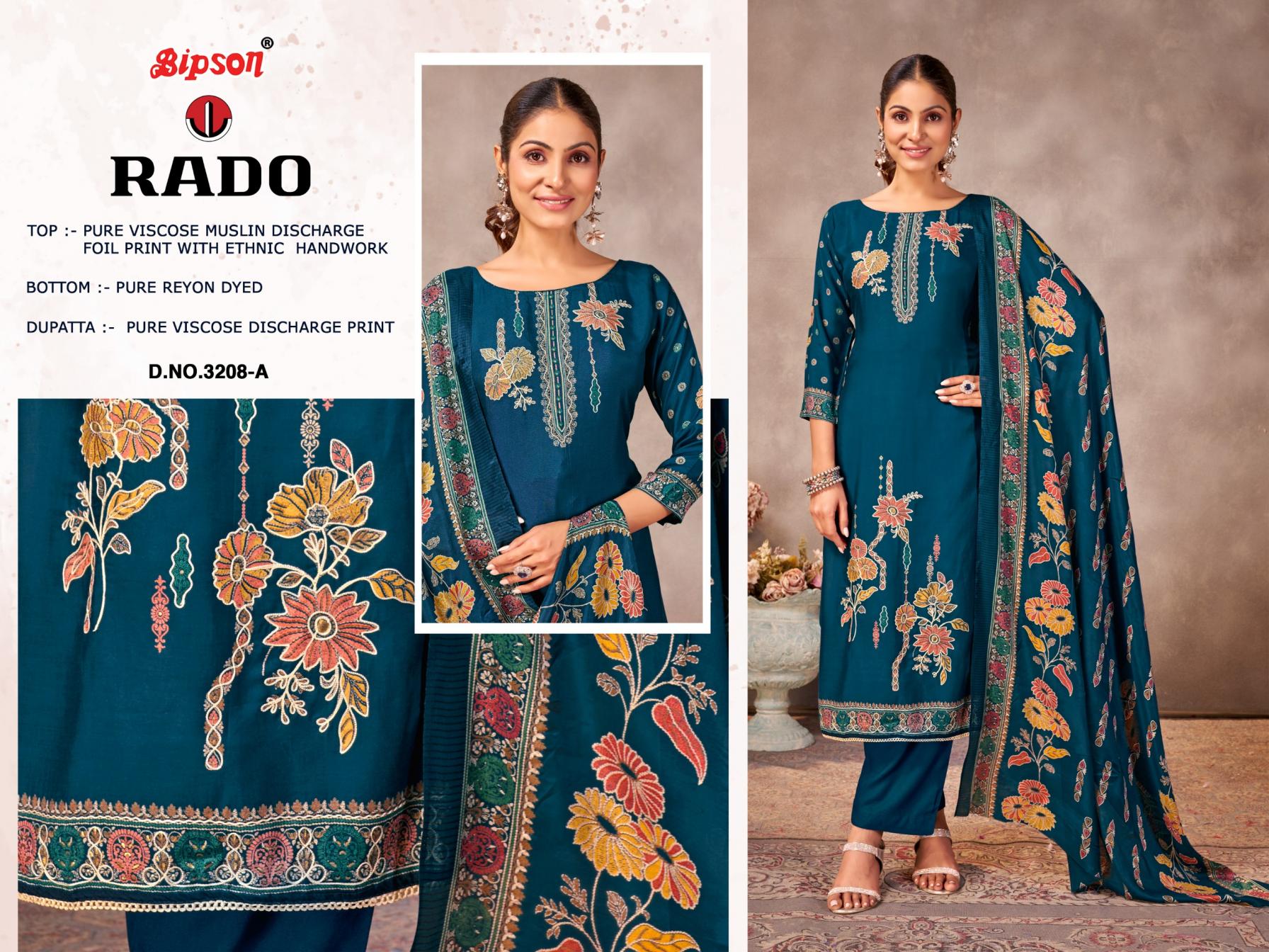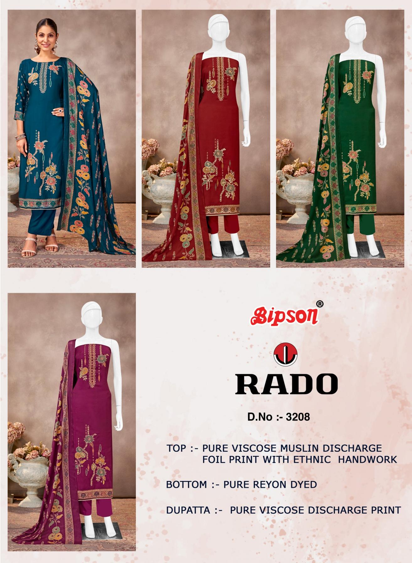 Looking for RADO 3208 BY BIPSON PRINTS VISCOSE MUSLIN UNSTITCH 3PCS DRESS Full Catalouge at Best Price? Buy Now RADO 3208 BY BIPSON PRINTS VISCOSE MUSLIN UNSTITCH 3PCS DRESS at Wholesale Rate of Rs 3700 with Total 4 Pcs from authroized dealer and supplier of Bipson Fashion Brand. Cost of Each piece is just only Rs 925 which is very low and affordable price to resale the product in your retail store. rrgandhi is Surat based Wholesale Supplier & Dealer of Bipson Fashion Brand. Click on Brand name to Know more about Brand's products.
