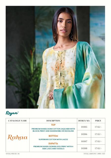 Looking for rahaa by reyna handloom cotton jacquard classic dress material online Full Catalouge at Best Price? Buy Now rahaa by reyna handloom cotton jacquard classic dress material online at Wholesale Rate of Rs 5235 with Total 3 Pcs from authroized dealer and supplier of Reyna Brand. Cost of Each piece is just only Rs 1745 which is very low and affordable price to resale the product in your retail store. rrgandhi is Surat based Wholesale Supplier & Dealer of Reyna Brand. Click on Brand name to Know more about Brand's products.