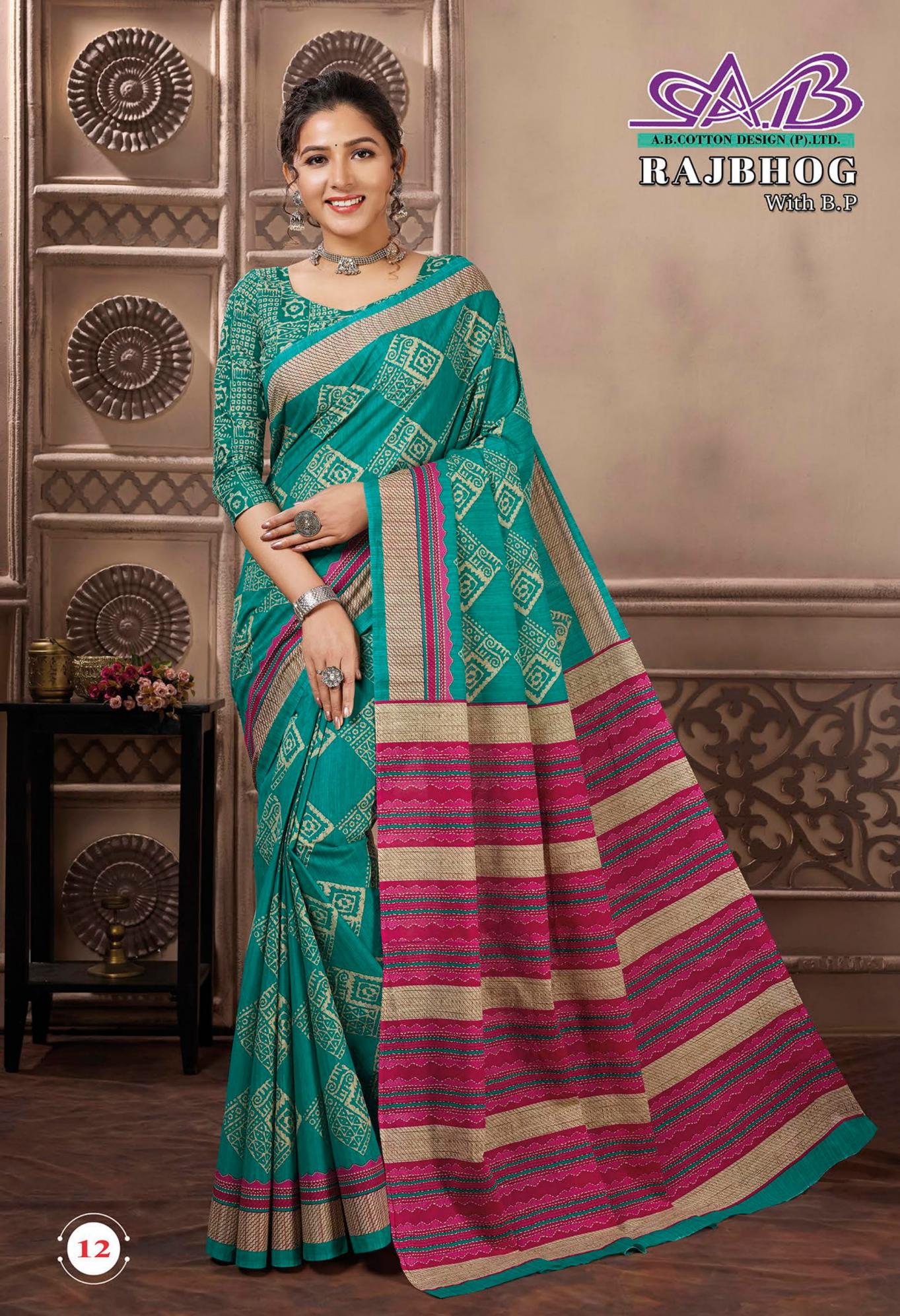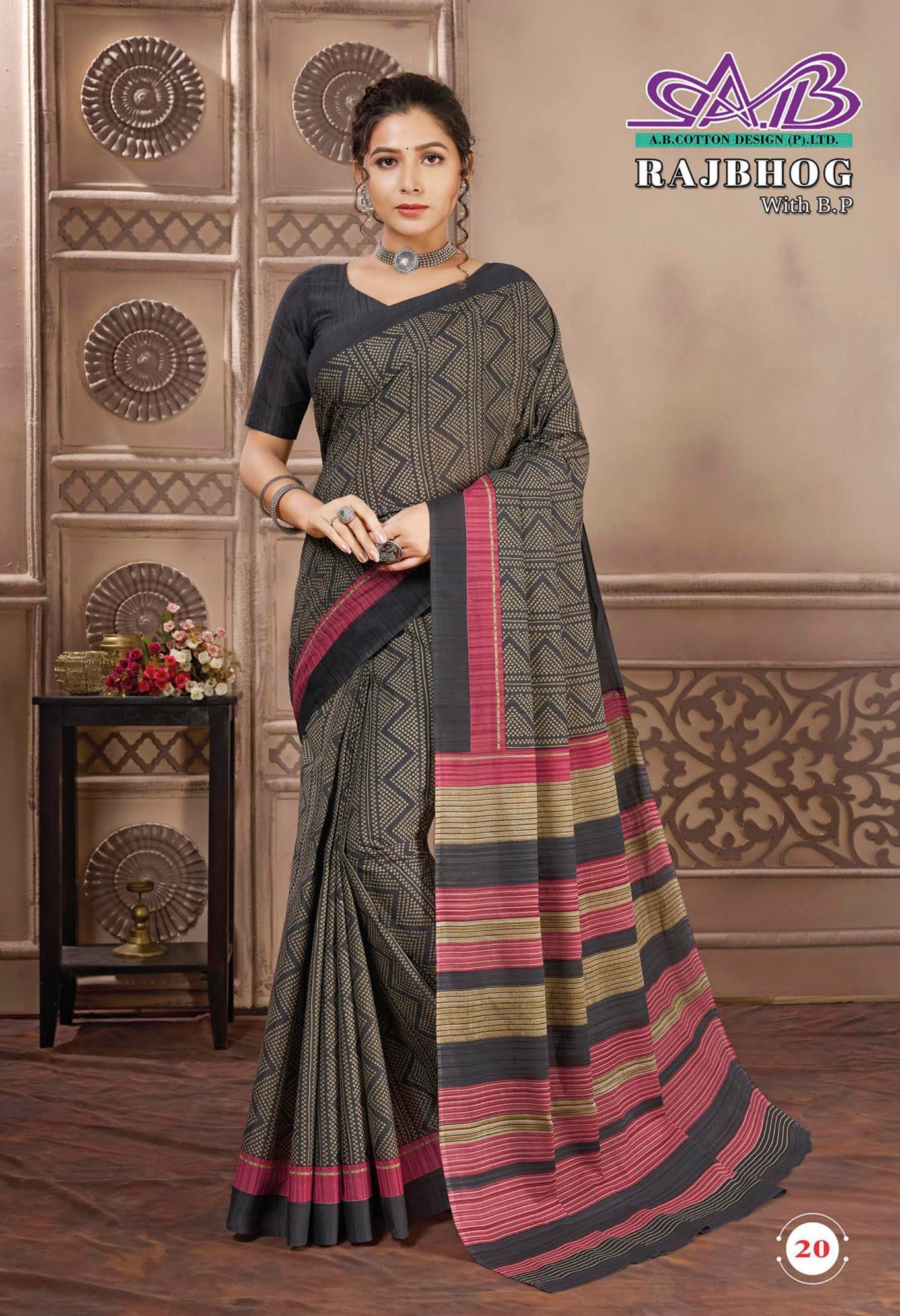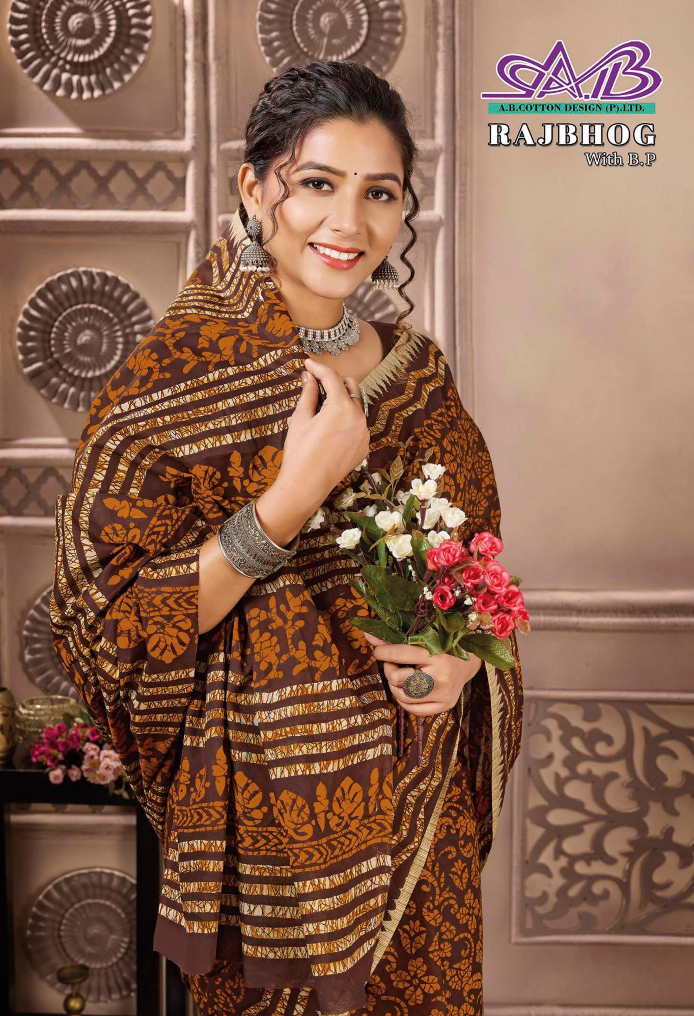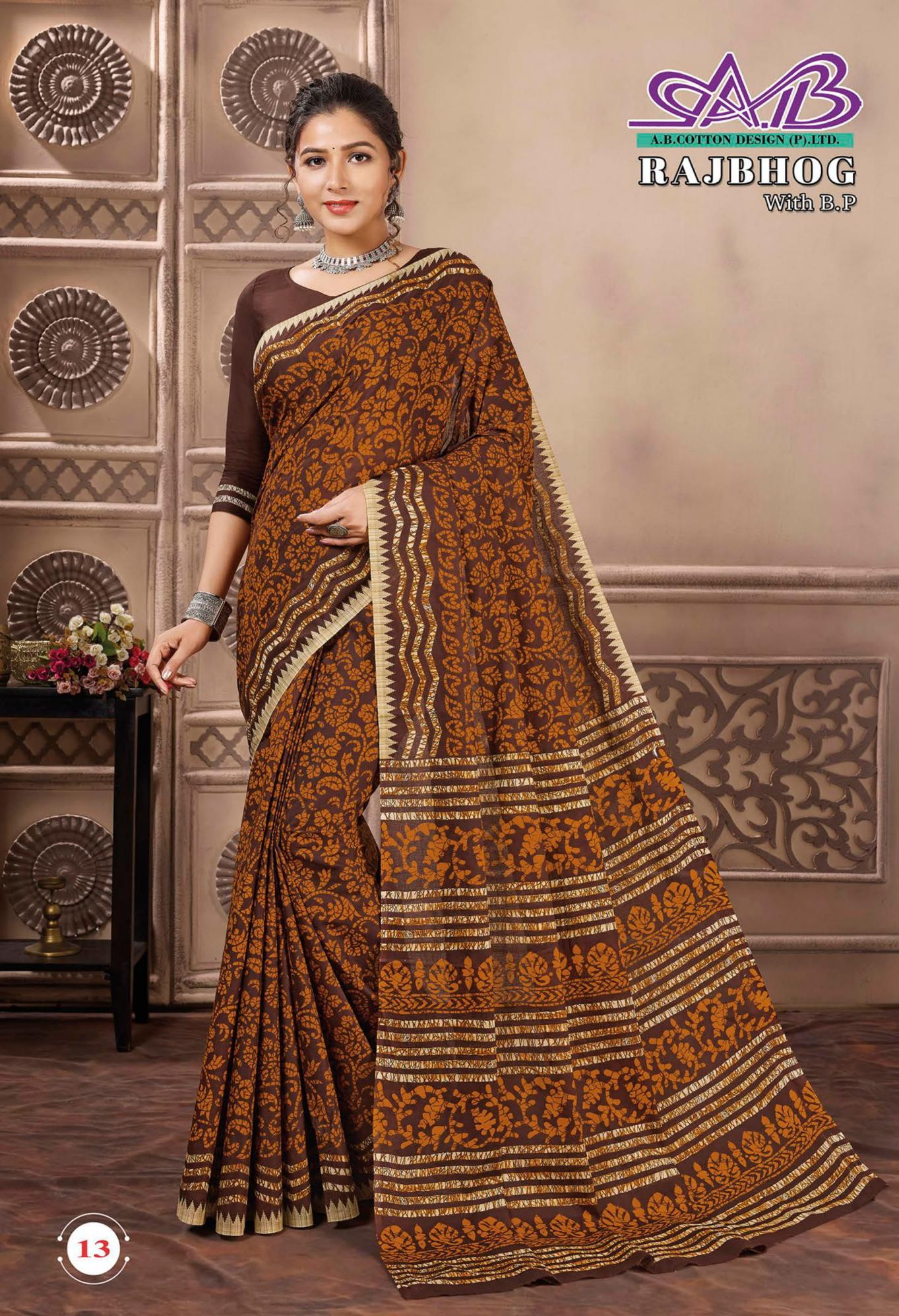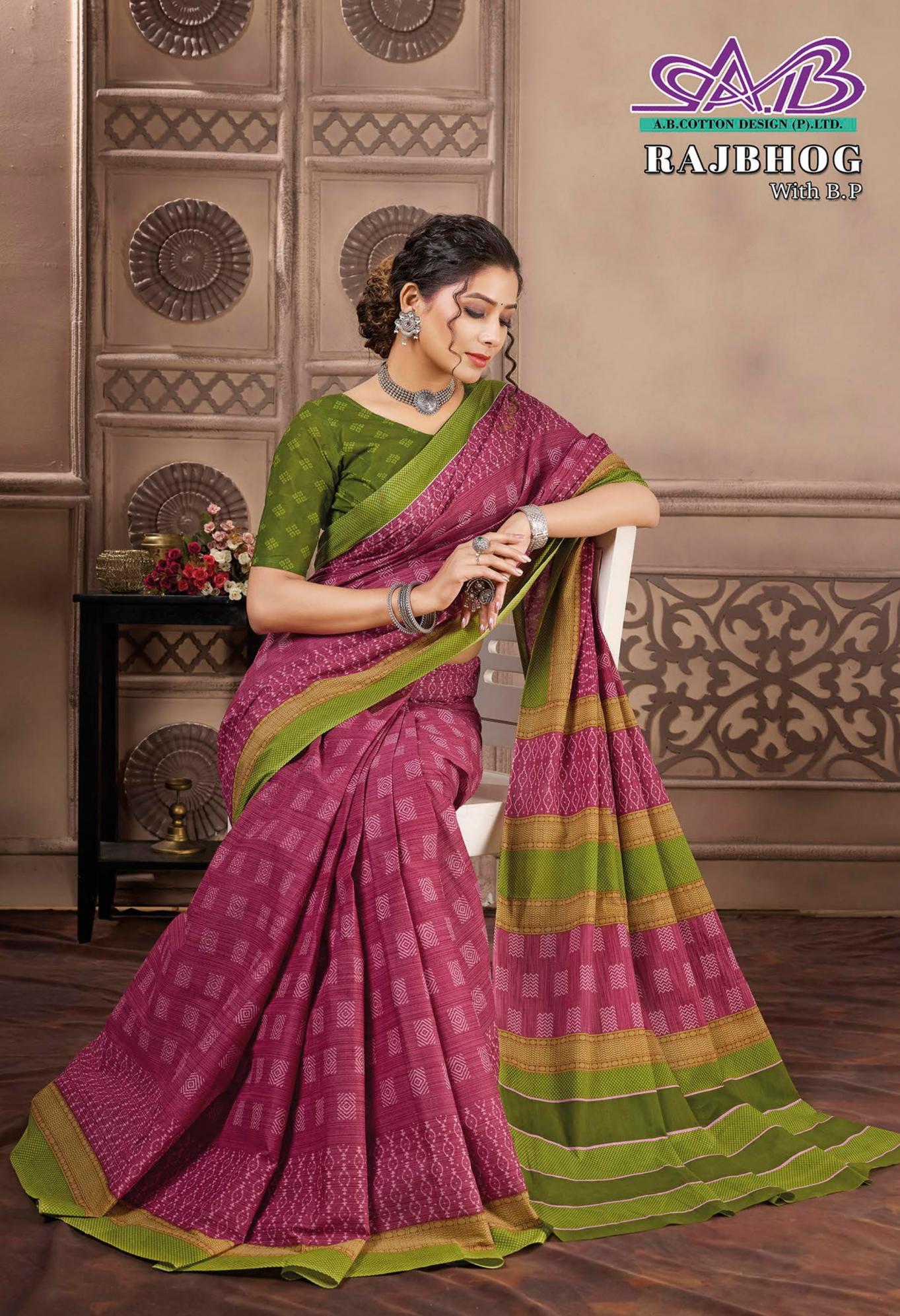 Looking for RAJBHOG BY AB MALAI COTTON PRETTY LOOK SAREES Full Catalouge at Best Price? Buy Now RAJBHOG BY AB MALAI COTTON PRETTY LOOK SAREES at Wholesale Rate of Rs 7910 with Total 14 Pcs from authroized dealer and supplier of A B Cotton Design Brand. Cost of Each piece is just only Rs 565 which is very low and affordable price to resale the product in your retail store. rrgandhi is Surat based Wholesale Supplier & Dealer of A B Cotton Design Brand. Click on Brand name to Know more about Brand's products.