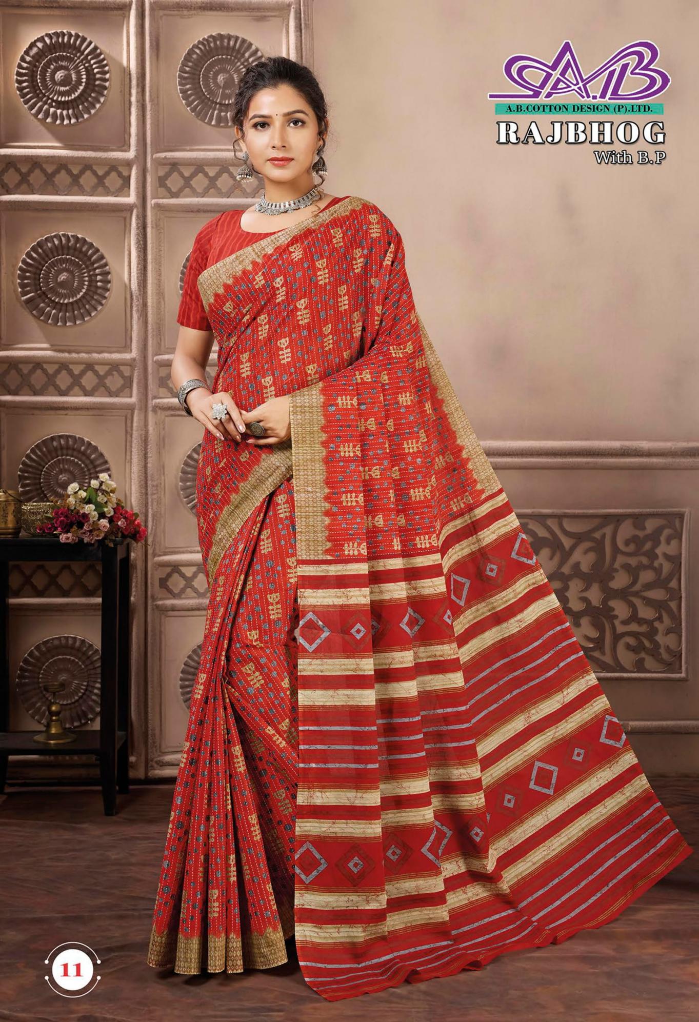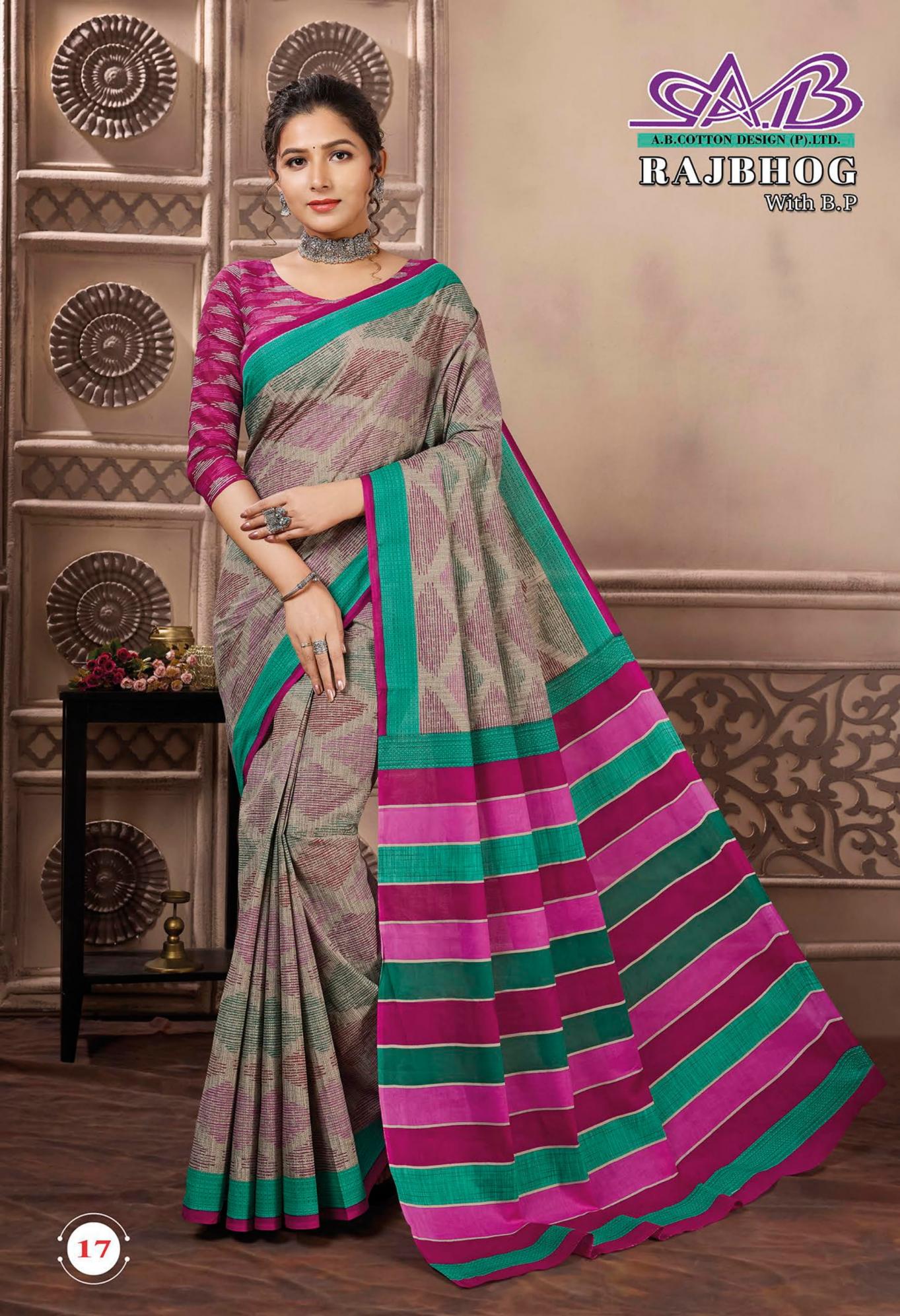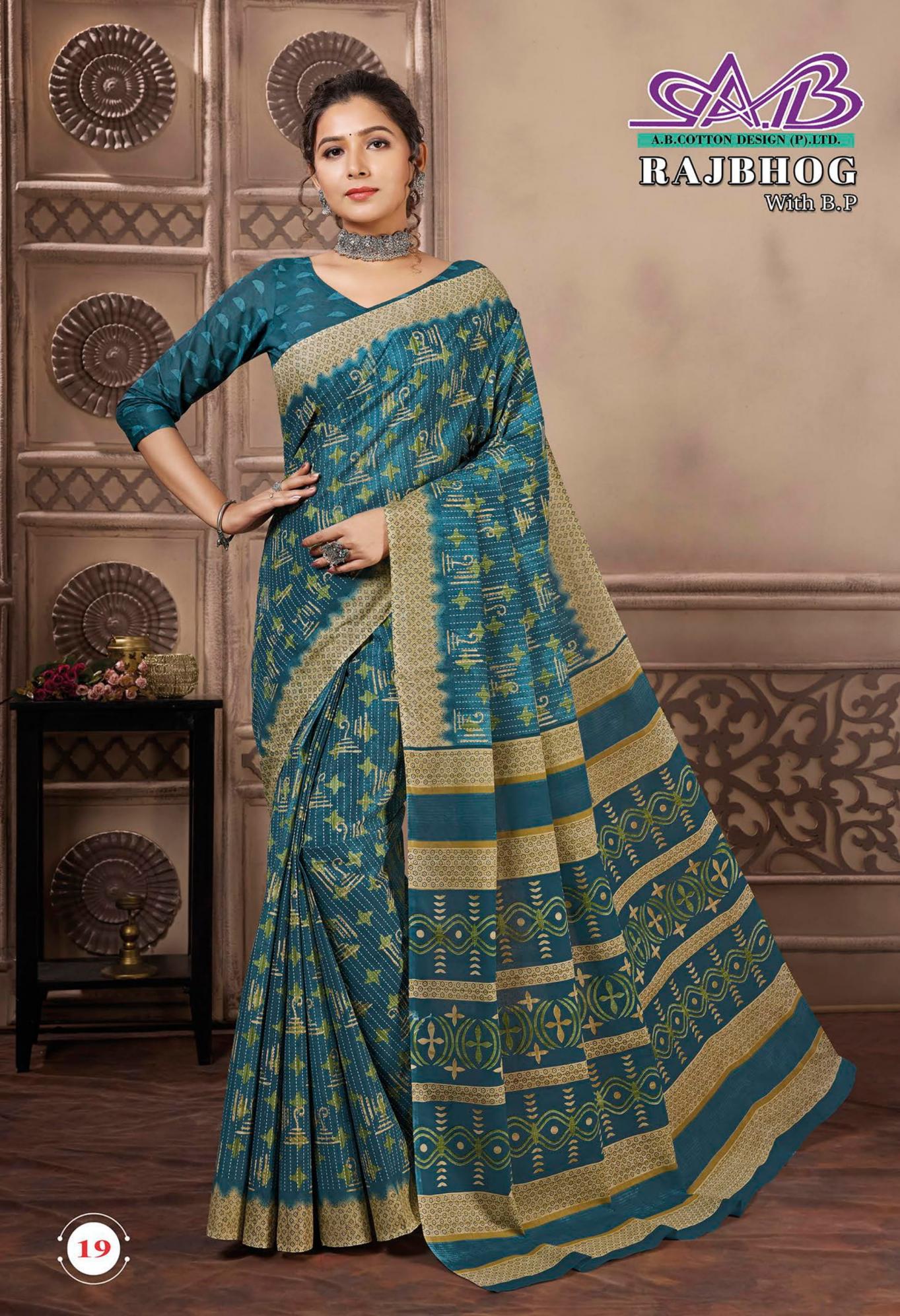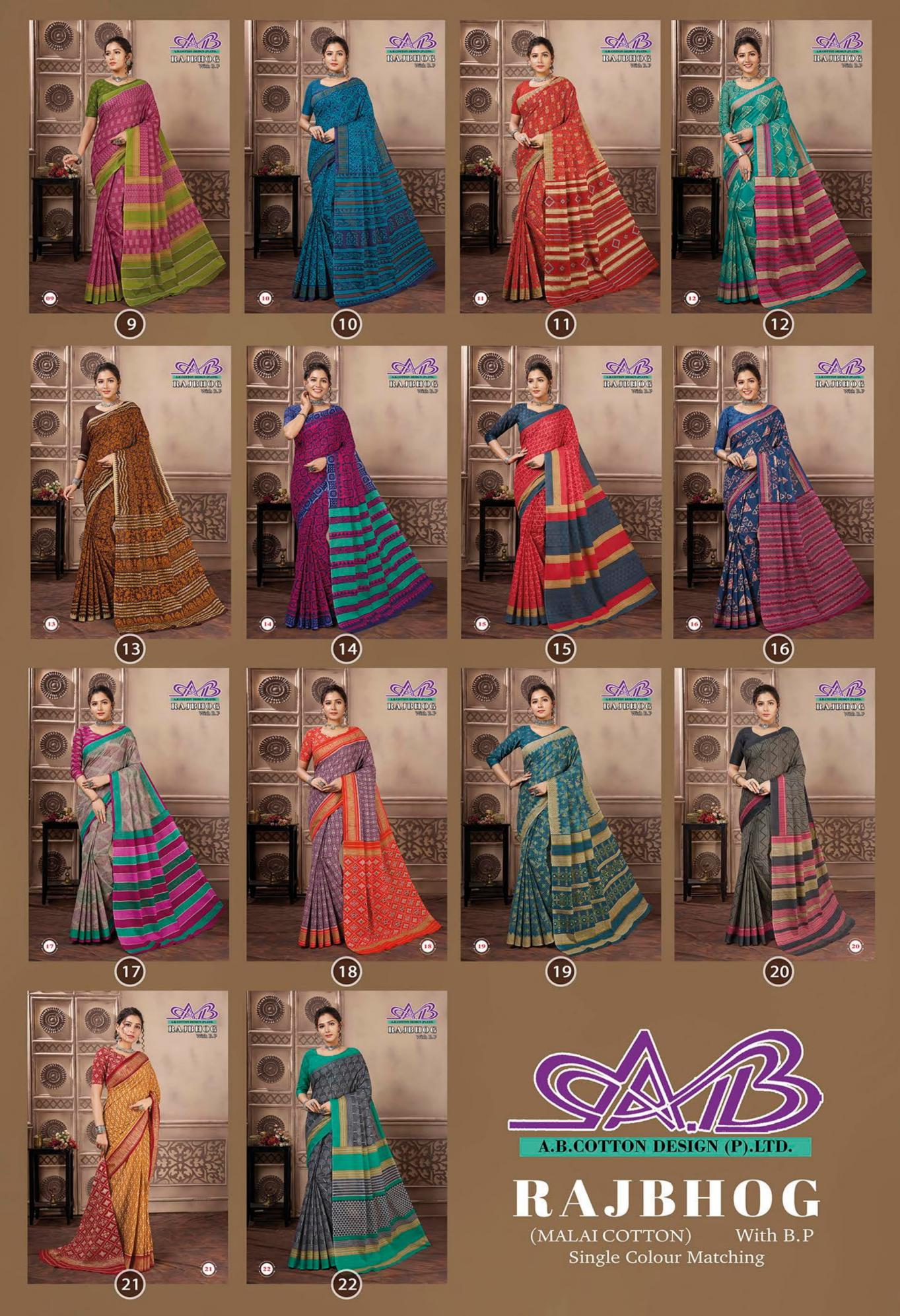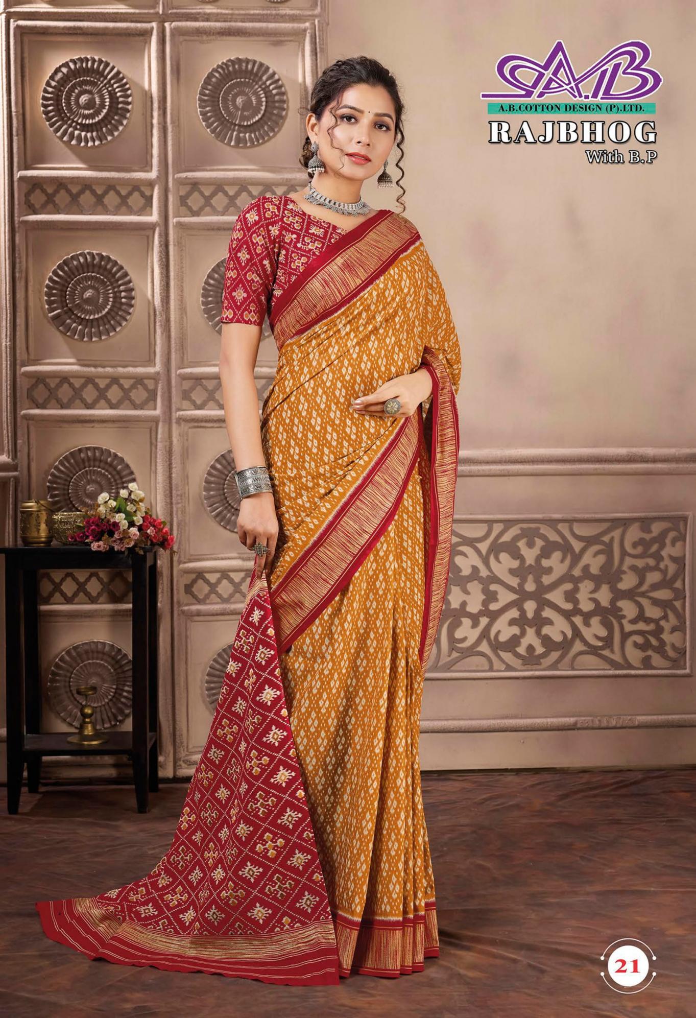 Looking for RAJBHOG BY AB MALAI COTTON PRETTY LOOK SAREES Full Catalouge at Best Price? Buy Now RAJBHOG BY AB MALAI COTTON PRETTY LOOK SAREES at Wholesale Rate of Rs 7910 with Total 14 Pcs from authroized dealer and supplier of A B Cotton Design Brand. Cost of Each piece is just only Rs 565 which is very low and affordable price to resale the product in your retail store. rrgandhi is Surat based Wholesale Supplier & Dealer of A B Cotton Design Brand. Click on Brand name to Know more about Brand's products.