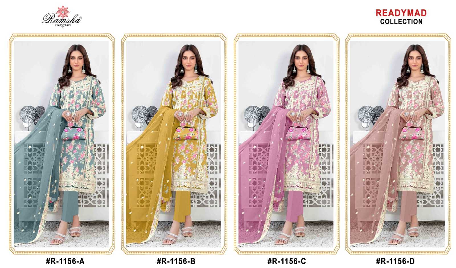 Looking for ramsha 1156 organza embroidery work readymade pakistani salwar suit Full Catalouge at Best Price? Buy Now ramsha 1156 organza embroidery work readymade pakistani salwar suit at Wholesale Rate of Rs 11600 with Total 8 Pcs from authroized dealer and supplier of Ramsha Brand. Cost of Each piece is just only Rs 1450 which is very low and affordable price to resale the product in your retail store. rrgandhi is Surat based Wholesale Supplier & Dealer of Ramsha Brand. Click on Brand name to Know more about Brand's products.
