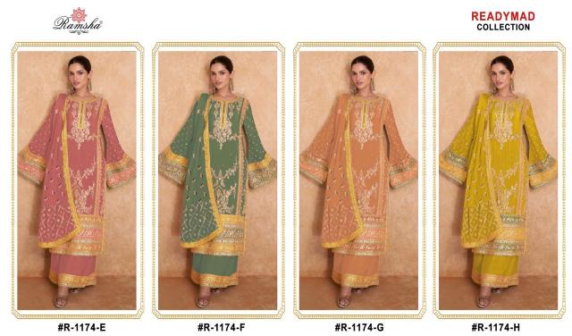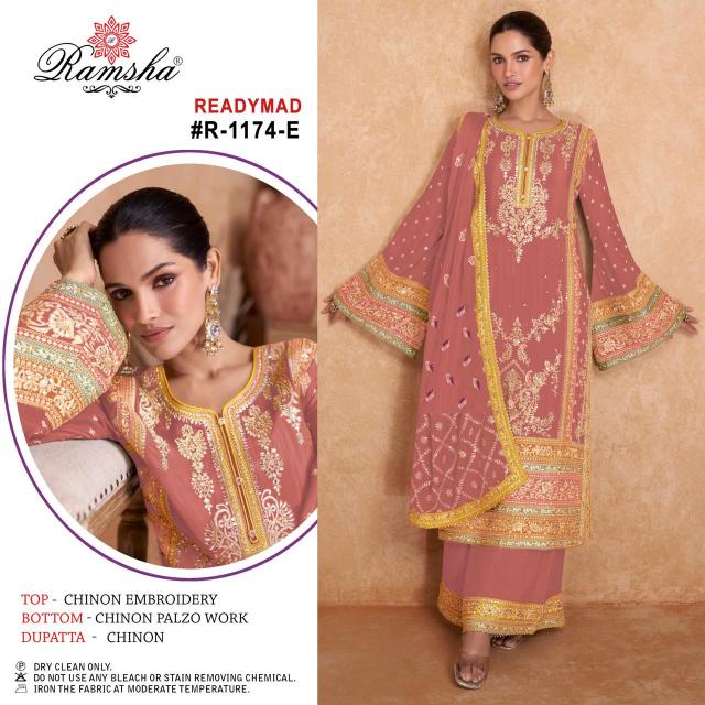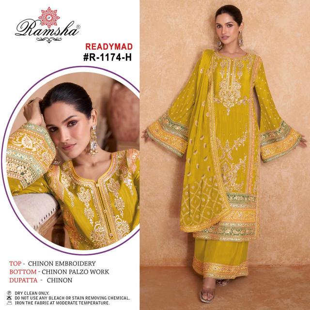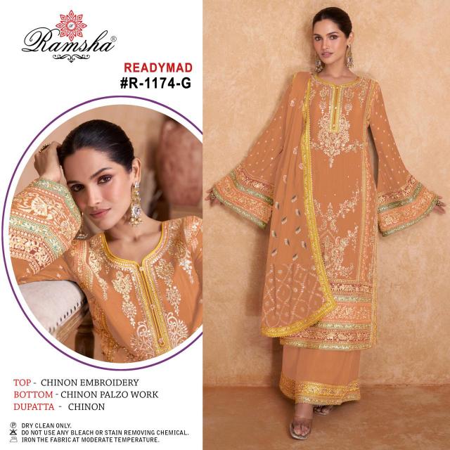 Looking for ramsha r 1174 nx new chart embroidery designer chinon suits with plazzo Full Catalouge at Best Price? Buy Now ramsha r 1174 nx new chart embroidery designer chinon suits with plazzo at Wholesale Rate of Rs 14800 with Total 8 Pcs from authroized dealer and supplier of Ramsha Brand. Cost of Each piece is just only Rs 1850 which is very low and affordable price to resale the product in your retail store. rrgandhi is Surat based Wholesale Supplier & Dealer of Ramsha Brand. Click on Brand name to Know more about Brand's products.