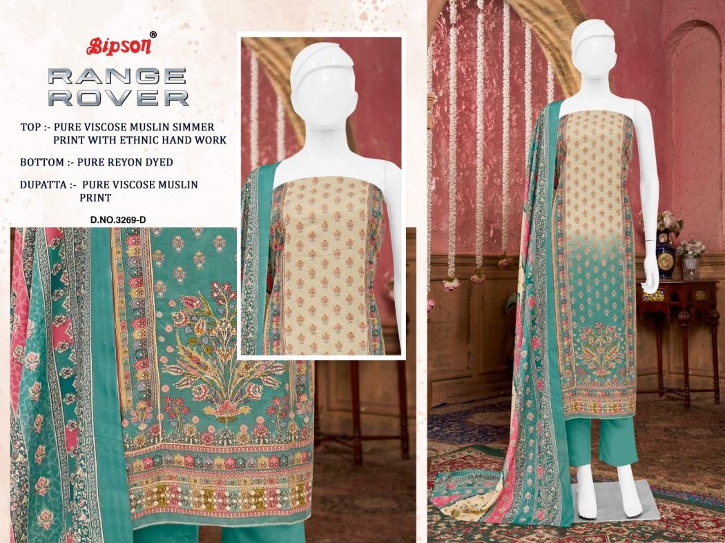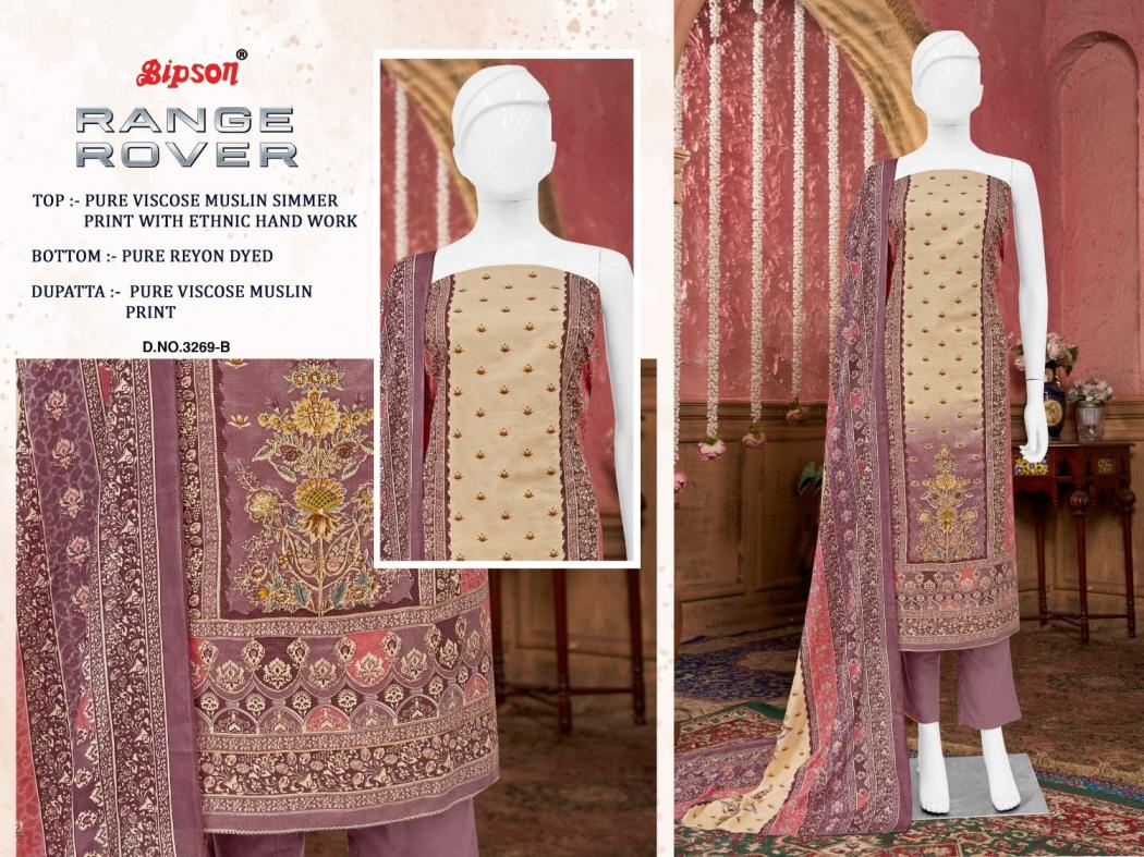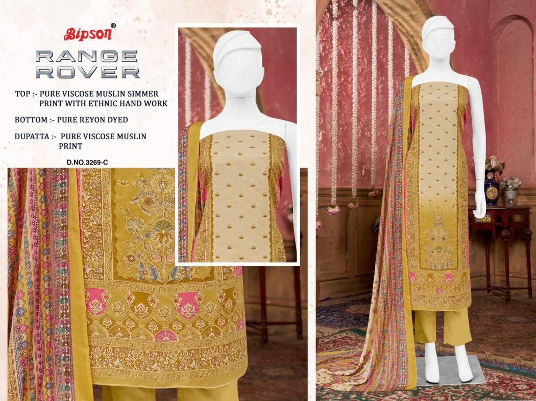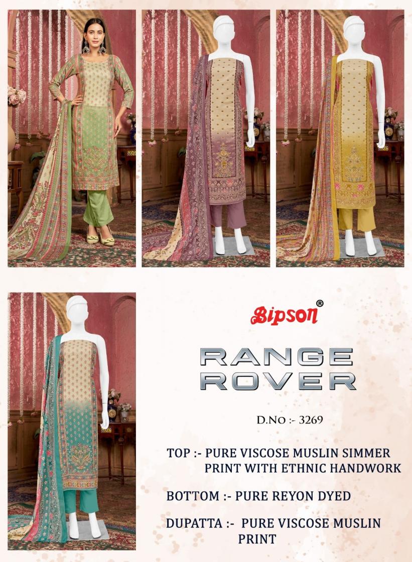 Looking for range rover 3269 by bipson prints viscose muslin stylish suits Full Catalouge at Best Price? Buy Now range rover 3269 by bipson prints viscose muslin stylish suits at Wholesale Rate of Rs 3460 with Total 4 Pcs from authroized dealer and supplier of Bipson Fashion Brand. Cost of Each piece is just only Rs 865 which is very low and affordable price to resale the product in your retail store. rrgandhi is Surat based Wholesale Supplier & Dealer of Bipson Fashion Brand. Click on Brand name to Know more about Brand's products.