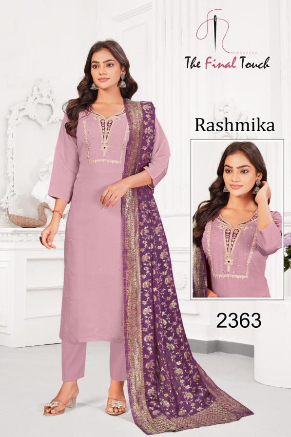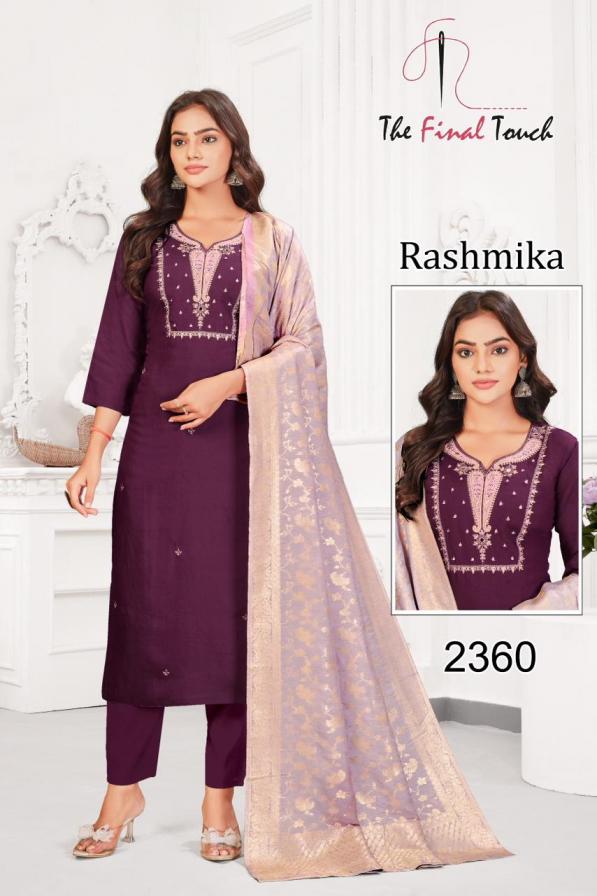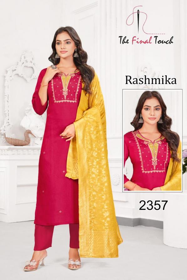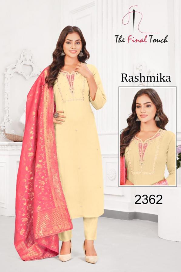 Looking for RASHMIKA BY THE FINAL TOUCH R R FASHION ROMAN READYMADE COMBO SUITS Full Catalouge at Best Price? Buy Now RASHMIKA BY THE FINAL TOUCH R R FASHION ROMAN READYMADE COMBO SUITS at Wholesale Rate of Rs 40400 with Total 40 Pcs from authroized dealer and supplier of The Final Touch Brand. Cost of Each piece is just only Rs 1010 which is very low and affordable price to resale the product in your retail store. rrgandhi is Surat based Wholesale Supplier & Dealer of The Final Touch Brand. Click on Brand name to Know more about Brand's products.