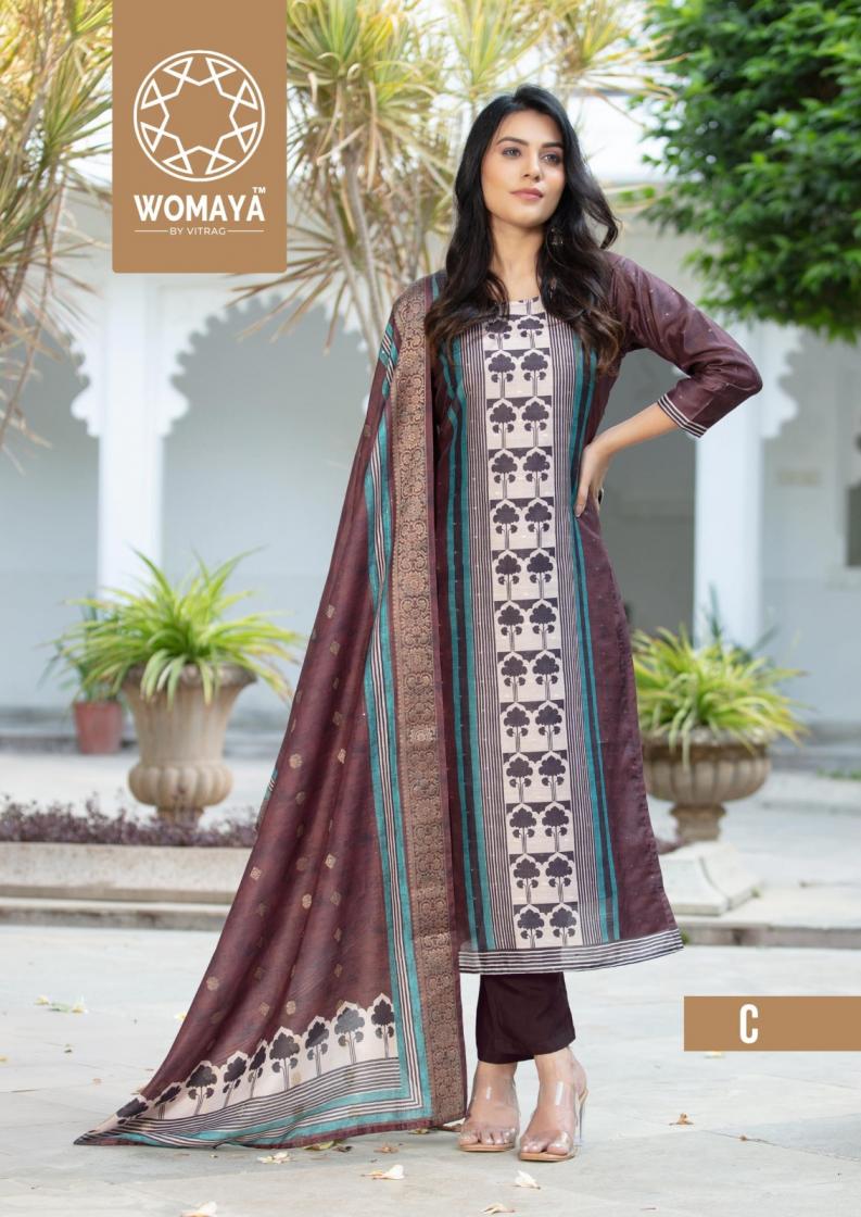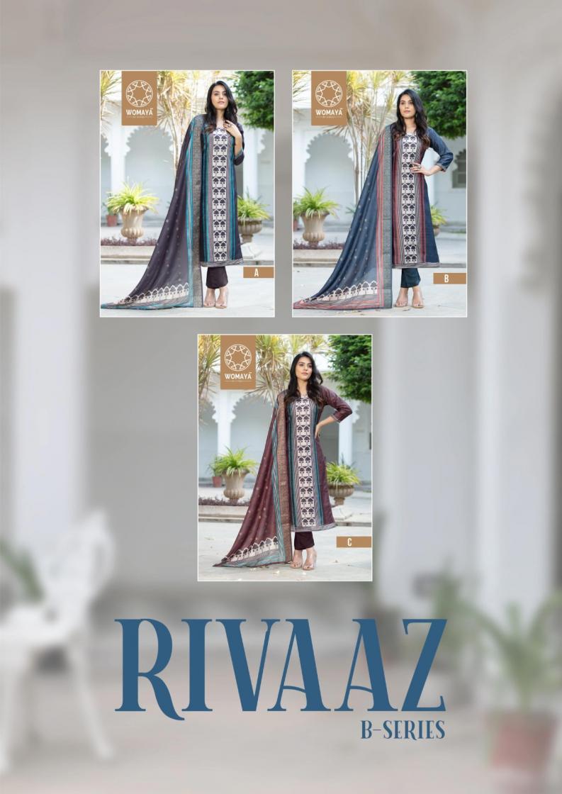 Looking for RIVAAZ JASMINE B SERIES BY WOMAYA MODAL SILK JACQUARD COMBO READYMADE SUITS Full Catalouge at Best Price? Buy Now RIVAAZ JASMINE B SERIES BY WOMAYA MODAL SILK JACQUARD COMBO READYMADE SUITS at Wholesale Rate of Rs 19425 with Total 15 Pcs from authroized dealer and supplier of Womaya Kurtis Brand. Cost of Each piece is just only Rs 1295 which is very low and affordable price to resale the product in your retail store. rrgandhi is Surat based Wholesale Supplier & Dealer of Womaya Kurtis Brand. Click on Brand name to Know more about Brand's products.