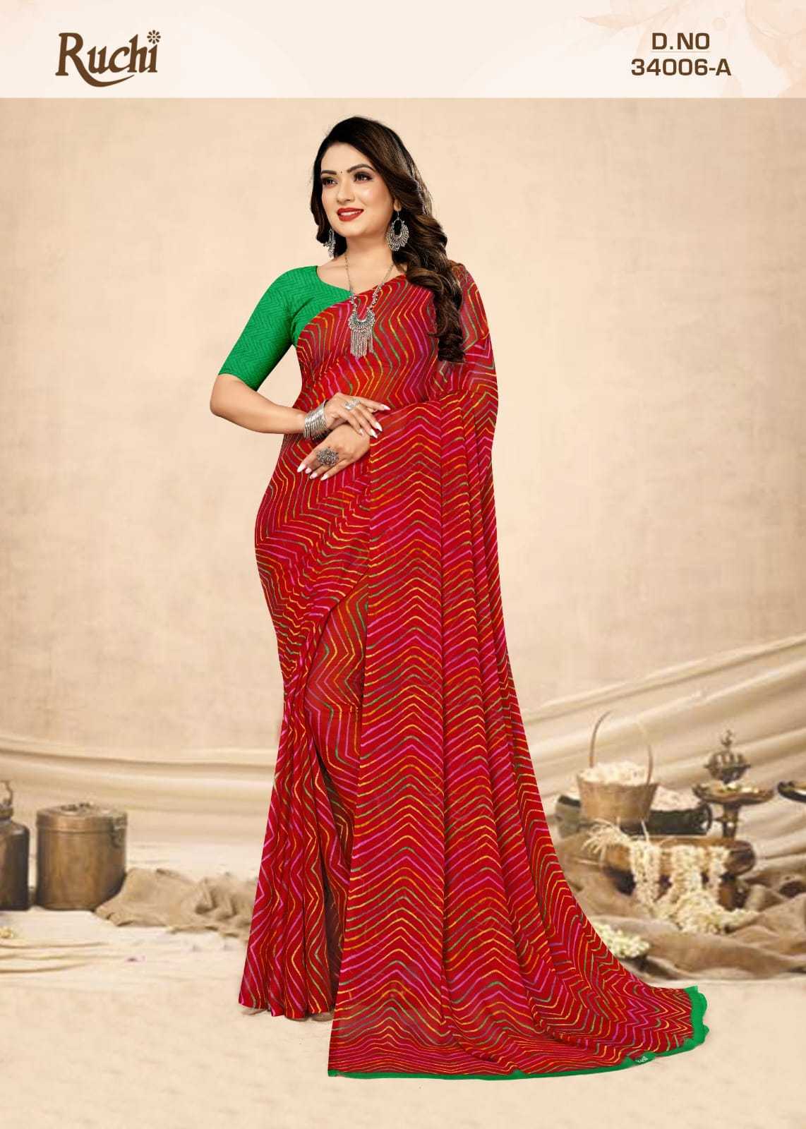 Looking for ruchee star chiffon lehriya 34006 fancy wear chiffon saree collection Full Catalouge at Best Price? Buy Now ruchee star chiffon lehriya 34006 fancy wear chiffon saree collection at Wholesale Rate of Rs 2502 with Total 6 Pcs from authroized dealer and supplier of Ruchee Fashion Brand. Cost of Each piece is just only Rs 417 which is very low and affordable price to resale the product in your retail store. rrgandhi is Surat based Wholesale Supplier & Dealer of Ruchee Fashion Brand. Click on Brand name to Know more about Brand's products.