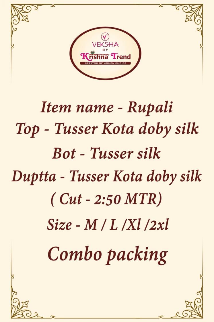 Looking for RUPALI BY VEKSHA KRISHNA TREND FULL STITCH TUSSAR KOTA SILK COMBO 3PCS DRESS Full Catalouge at Best Price? Buy Now RUPALI BY VEKSHA KRISHNA TREND FULL STITCH TUSSAR KOTA SILK COMBO 3PCS DRESS at Wholesale Rate of Rs 28320 with Total 24 Pcs from authroized dealer and supplier of Veksha Krishna Trend Brand. Cost of Each piece is just only Rs 1180 which is very low and affordable price to resale the product in your retail store. rrgandhi is Surat based Wholesale Supplier & Dealer of Veksha Krishna Trend Brand. Click on Brand name to Know more about Brand's products.