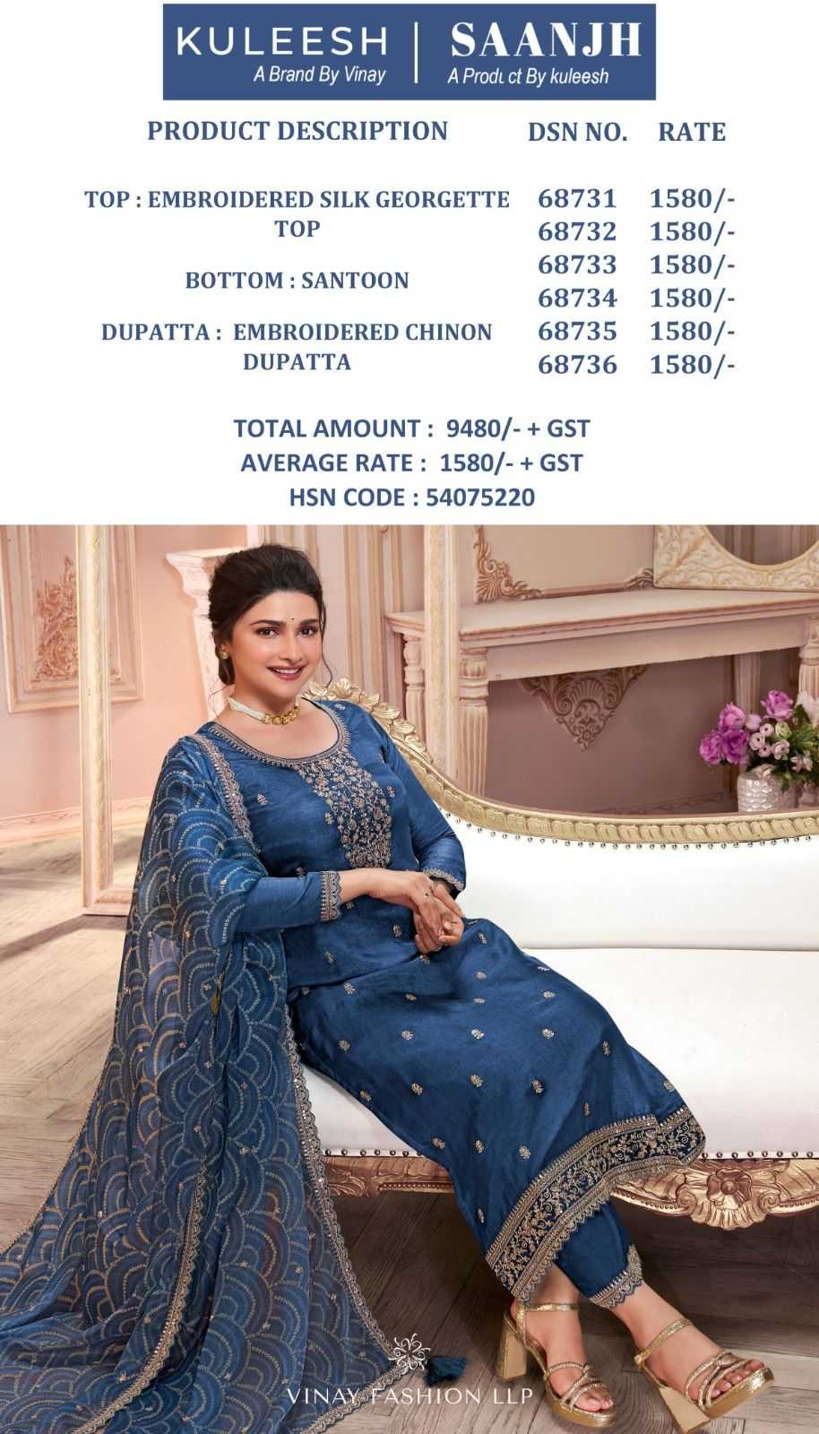 Looking for saanjh by vinay embroidered silk georgette party wear salwar suit material Full Catalouge at Best Price? Buy Now saanjh by vinay embroidered silk georgette party wear salwar suit material at Wholesale Rate of Rs 9480 with Total 6 Pcs from authroized dealer and supplier of Brand. Cost of Each piece is just only Rs 1580 which is very low and affordable price to resale the product in your retail store. rrgandhi is Surat based Wholesale Supplier & Dealer of Brand. Click on Brand name to Know more about Brand's products.
