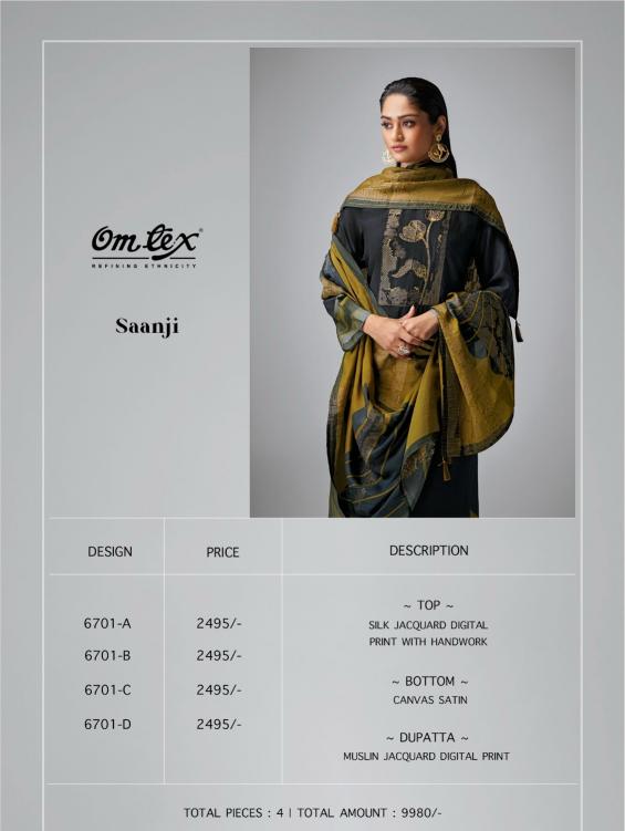 Looking for saanji by omtex silk jacquard shop trendy unstitch suit for women Full Catalouge at Best Price? Buy Now saanji by omtex silk jacquard shop trendy unstitch suit for women at Wholesale Rate of Rs 9980 with Total 4 Pcs from authroized dealer and supplier of Om Tex Brand. Cost of Each piece is just only Rs 2495 which is very low and affordable price to resale the product in your retail store. rrgandhi is Surat based Wholesale Supplier & Dealer of Om Tex Brand. Click on Brand name to Know more about Brand's products.