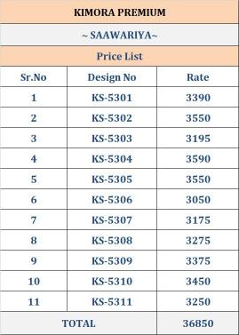 Looking for saawariya by kimora 5301-5311 attractive look saree online Full Catalouge at Best Price? Buy Now saawariya by kimora 5301-5311 attractive look saree online at Wholesale Rate of Rs 36850 with Total 11 Pcs from authroized dealer and supplier of KIMORA Brand. Cost of Each piece is just only Rs 3350 which is very low and affordable price to resale the product in your retail store. rrgandhi is Surat based Wholesale Supplier & Dealer of KIMORA Brand. Click on Brand name to Know more about Brand's products.