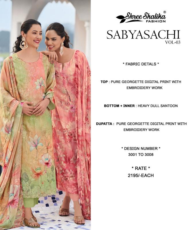 Looking for sabyasachi vol 3 by shree shalika georgette print popular design dress material online Full Catalouge at Best Price? Buy Now sabyasachi vol 3 by shree shalika georgette print popular design dress material online at Wholesale Rate of Rs 17560 with Total 8 Pcs from authroized dealer and supplier of Shree Shalika Fashion Brand. Cost of Each piece is just only Rs 2195 which is very low and affordable price to resale the product in your retail store. rrgandhi is Surat based Wholesale Supplier & Dealer of Shree Shalika Fashion Brand. Click on Brand name to Know more about Brand's products.