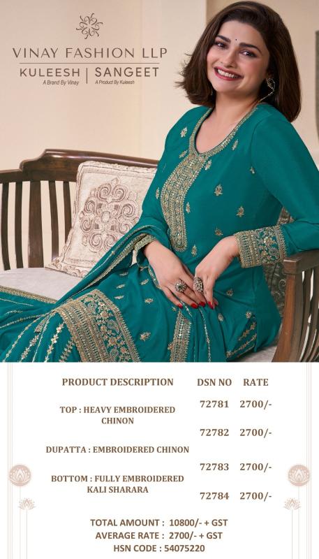 Looking for sangeet by kuleesh vinay fashion chinon party wear unstitch salwar suit set Full Catalouge at Best Price? Buy Now sangeet by kuleesh vinay fashion chinon party wear unstitch salwar suit set at Wholesale Rate of Rs 10800 with Total 4 Pcs from authroized dealer and supplier of Vinay Fashion Brand. Cost of Each piece is just only Rs 2700 which is very low and affordable price to resale the product in your retail store. rrgandhi is Surat based Wholesale Supplier & Dealer of Vinay Fashion Brand. Click on Brand name to Know more about Brand's products.