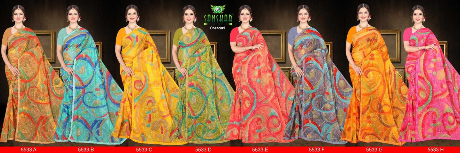 Looking for sanskar surmedani vol 2 stylish wear chiffon saree wholesaler Full Catalouge at Best Price? Buy Now sanskar surmedani vol 2 stylish wear chiffon saree wholesaler at Wholesale Rate of Rs 4760 with Total 8 Pcs from authroized dealer and supplier of Sanskar Tex Prints Brand. Cost of Each piece is just only Rs 595 which is very low and affordable price to resale the product in your retail store. rrgandhi is Surat based Wholesale Supplier & Dealer of Sanskar Tex Prints Brand. Click on Brand name to Know more about Brand's products.