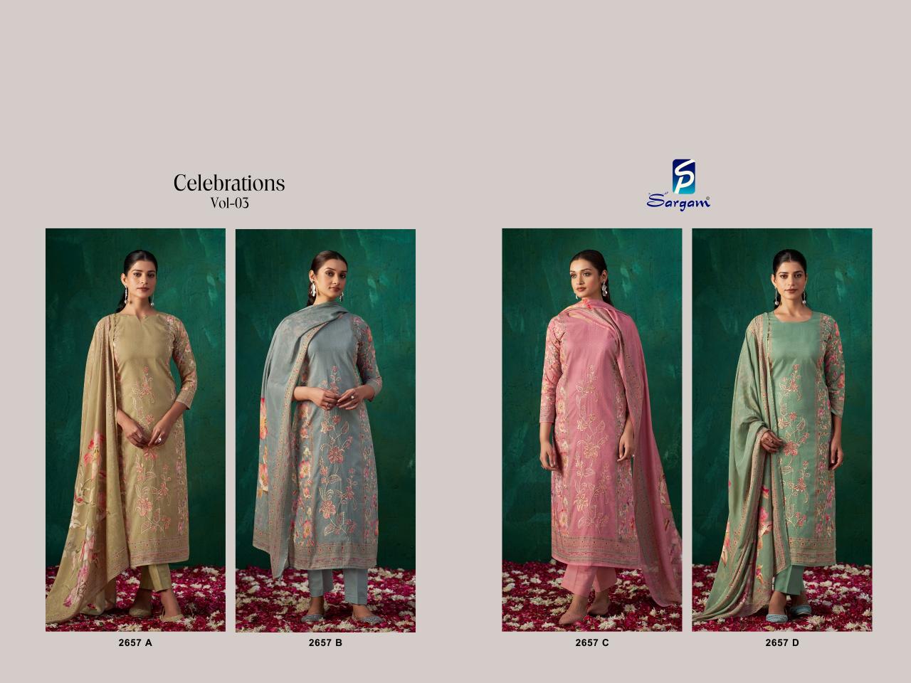 Looking for SARGAM CELEBRATION VOL 3 CAMBRIC DRESS MATERIALS Full Catalouge at Best Price? Buy Now SARGAM CELEBRATION VOL 3 CAMBRIC DRESS MATERIALS at Wholesale Rate of Rs 5004 with Total 4 Pcs from authroized dealer and supplier of Sargam Prints Brand. Cost of Each piece is just only Rs 1251 which is very low and affordable price to resale the product in your retail store. rrgandhi is Surat based Wholesale Supplier & Dealer of Sargam Prints Brand. Click on Brand name to Know more about Brand's products.