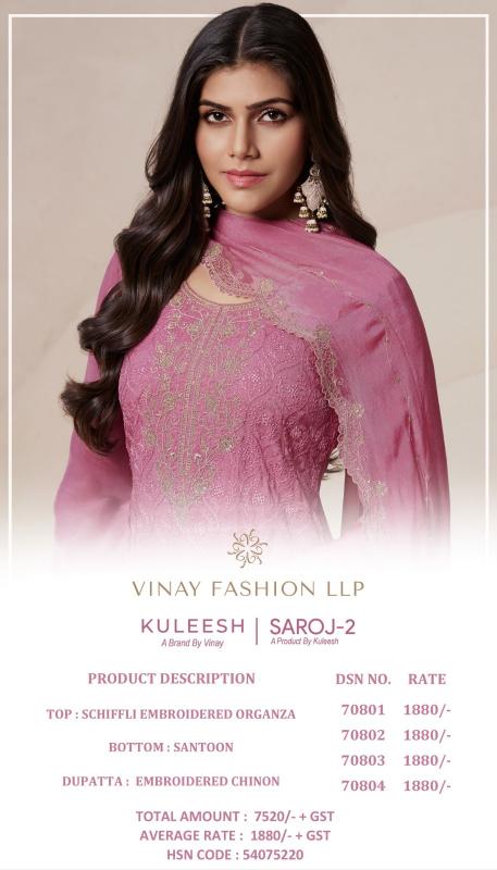 Looking for saroj vol 2 by vinay kuleesh organza embroidered unstitch suit for ladies Full Catalouge at Best Price? Buy Now saroj vol 2 by vinay kuleesh organza embroidered unstitch suit for ladies at Wholesale Rate of Rs 7200 with Total 4 Pcs from authroized dealer and supplier of Vinay Fashion Brand. Cost of Each piece is just only Rs 1800 which is very low and affordable price to resale the product in your retail store. rrgandhi is Surat based Wholesale Supplier & Dealer of Vinay Fashion Brand. Click on Brand name to Know more about Brand's products.