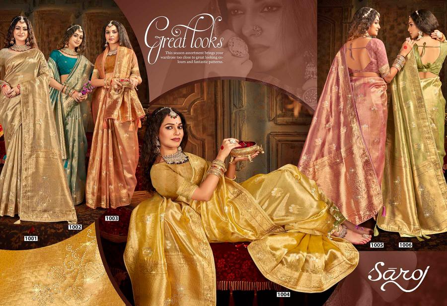 Looking for Satrani tissue jharkan Saroj vol.3 organza silk saree Full Catalouge at Best Price? Buy Now Satrani tissue jharkan Saroj vol.3 organza silk saree at Wholesale Rate of Rs 9990 with Total 6 Pcs from authroized dealer and supplier of Saroj Textiles Brand. Cost of Each piece is just only Rs 1665 which is very low and affordable price to resale the product in your retail store. rrgandhi is Surat based Wholesale Supplier & Dealer of Saroj Textiles Brand. Click on Brand name to Know more about Brand's products.