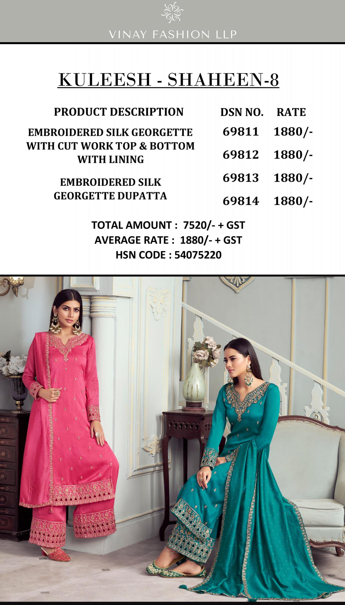 Looking for shahen vol 8 vinay kuleesh traditional indian wear georgette silk salwar suits Full Catalouge at Best Price? Buy Now shahen vol 8 vinay kuleesh traditional indian wear georgette silk salwar suits at Wholesale Rate of Rs 7520 with Total 4 Pcs from authroized dealer and supplier of Vinay Fashion Brand. Cost of Each piece is just only Rs 1880 which is very low and affordable price to resale the product in your retail store. rrgandhi is Surat based Wholesale Supplier & Dealer of Vinay Fashion Brand. Click on Brand name to Know more about Brand's products.